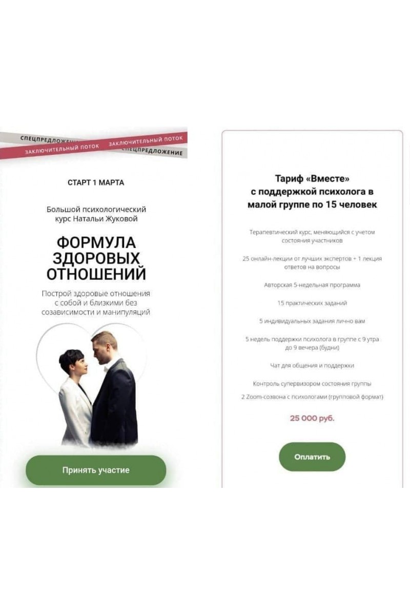 Курс подойдет Вам, если:Вы знаете, где у вас болит, что тревожит, что вызывает сопротивление, а что не дает уснутьВы знаете, от чего невыносимо устали и видите, ради чего готовы изменитьсяВам страшно и больно двигаться вперед, то и дело хочется «на ручки» или «поспать», но вы отважно идете в глубину себя, чтобы переродиться и подарить себе свою жизнь1 модульКак работать с личным дневникомЗдоровые отношения: как это?Роли, в которые мы играем в созависимых отношенияхВзросление. Что такое сформированное ЯПочему мы боимся отношений? Страх близостиЭмоции и чувства в отношениях, о чем они говорят, что маркируют и можно ли им верить2 МодульКоммуникация: что и как говоритьКак выйти из треугольника Карпмана. Как перестать быть жертвойГраницы: как сформировать и как их экологично озвучиватьИндивидуальность в здоровых отношениях. Немного про самооценкуЧто такое принятие? Как принятие влияет на отношения с собой и другими?3 МодульРазвитие личности, как индикатор здорового взаимодействия с партнёром. СамореализацияВыражение чувств. Как это делатьКак полюбить и принимать себя таким, какой ты естьСексуальная сторона здоровых отношенийОтношения младенца со значимыми объектами, как прототип дальнейших отношений4 МодульКак изменить старые привычки. Как перестать строить отношения, которые не работают для нас?Тяга и эмоциональные срывыЕсли отношения не сложились, что именно это означает? Как выходить из нездоровых отношенийКонфликт: почему он необходим и какая его истинная роль в здоровых отношениях?Стадии развития отношений5 МодульКартина мираКруги близости6 МодульПрямой эфир Финансовые установкиФинансовая независимость у созависимыхЗавершающий эфир с Натальей ЖуковойПоддерживающая лекция Виктории Пашковской7. Бонусные лекции для участников курса «Формула здоровых отношений 3.0»Как справиться со стрессом и хронической усталостью, чтобы воплощать задуманное в жизньСтыд тела и сексуальностьКак жить с зависимым человекомДетские травмы. Фрустрация, травма и последствияСепарацияЭротическая стимуляция. Что делает нас привлекательнымиЧто останется с вами после этого курса:Способность экологично демонстрировать свои эмоцииСтремление создать здоровые отношения либо трансформировать старые отношения в здоровые и прочныеСтремление создать здоровые отношения либо трансформировать старые отношения в здоровые и прочныеУмение просить о помощи и поддержкеЛюбовь к себе самая трепетная, искренняя и настоящаяДоверие себе и своему выборуФокус на независимость во всех смыслах: эмоциональную, финансовую, психологическуюУмение различать свои чувства, желания и потребности и смело говорить о них миру так, что это будет взаимноСтремление сделать, наконец, себя счастливым (ой)