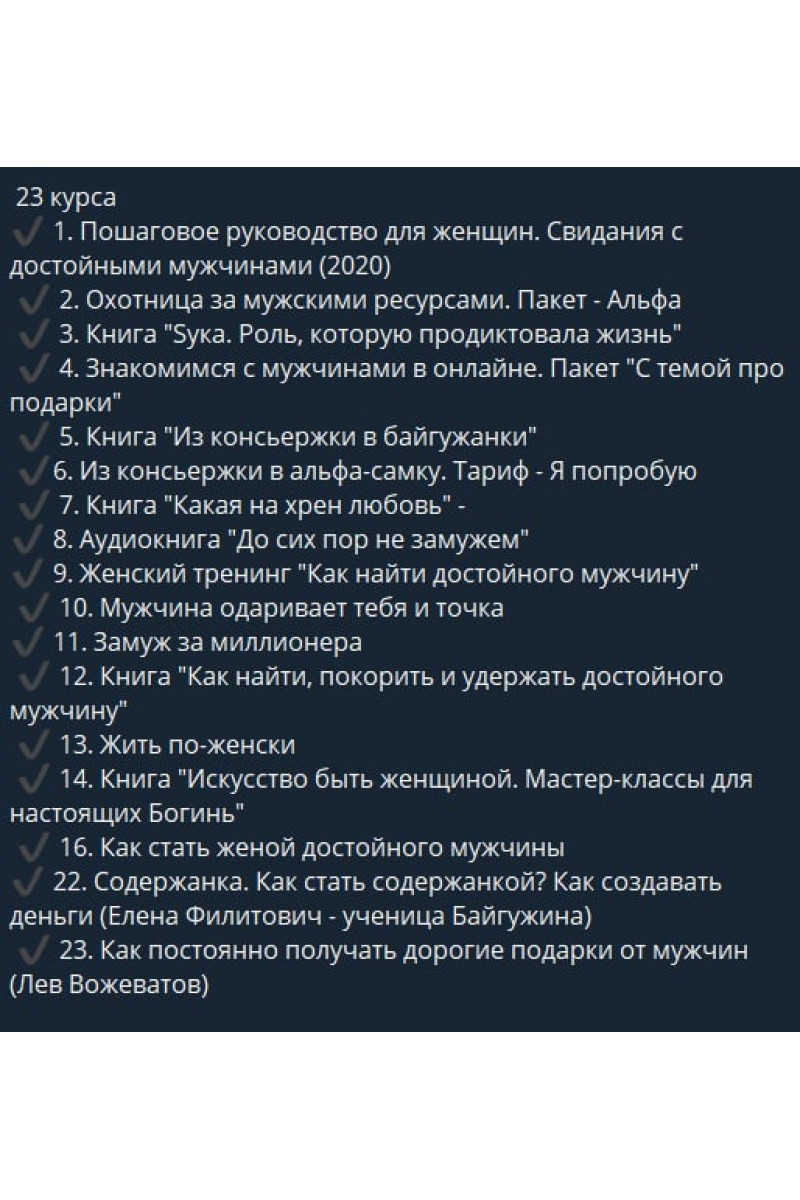 23 курса ✔️ 1. Пошаговое руководство для женщин. Свидания с достойными мужчинами (2020) ✔️ 2. Охотница за мужскими ресурсами. Пакет - Альфа ✔️ 3. Книга "Sука. Роль, которую продиктовала жизнь" ✔️ 4. Знакомимся с мужчинами в онлайне. Пакет "С темой про подарки" ✔️ 5. Книга "Из консьержки в байгужанки" ✔️6. Из консьержки в альфа-самку. Тариф - Я попробую ✔️ 7. Книга "Какая на хрен любовь" -✔️ 8. Аудиокнига "До сих пор не замужем" ✔️ 9. Женский тренинг "Как найти достойного мужчину" ✔️ 10. Мужчина одаривает тебя и точка ✔️ 11. Замуж за миллионера ✔️ 12. Книга "Как найти, покорить и удержать достойного мужчину" ✔️ 13. Жить по-женски ✔️ 14. Книга "Искусство быть женщиной. Мастер-классы для настоящих Богинь" ✔️ 16. Как стать женой достойного мужчины ✔️ 22. Содержанка. Как стать содержанкой? Как создавать деньги (Елена Филитович - ученица Байгужина) ✔️ 23. Как постоянно получать дорогие подарки от мужчин (Лев Вожеватов)