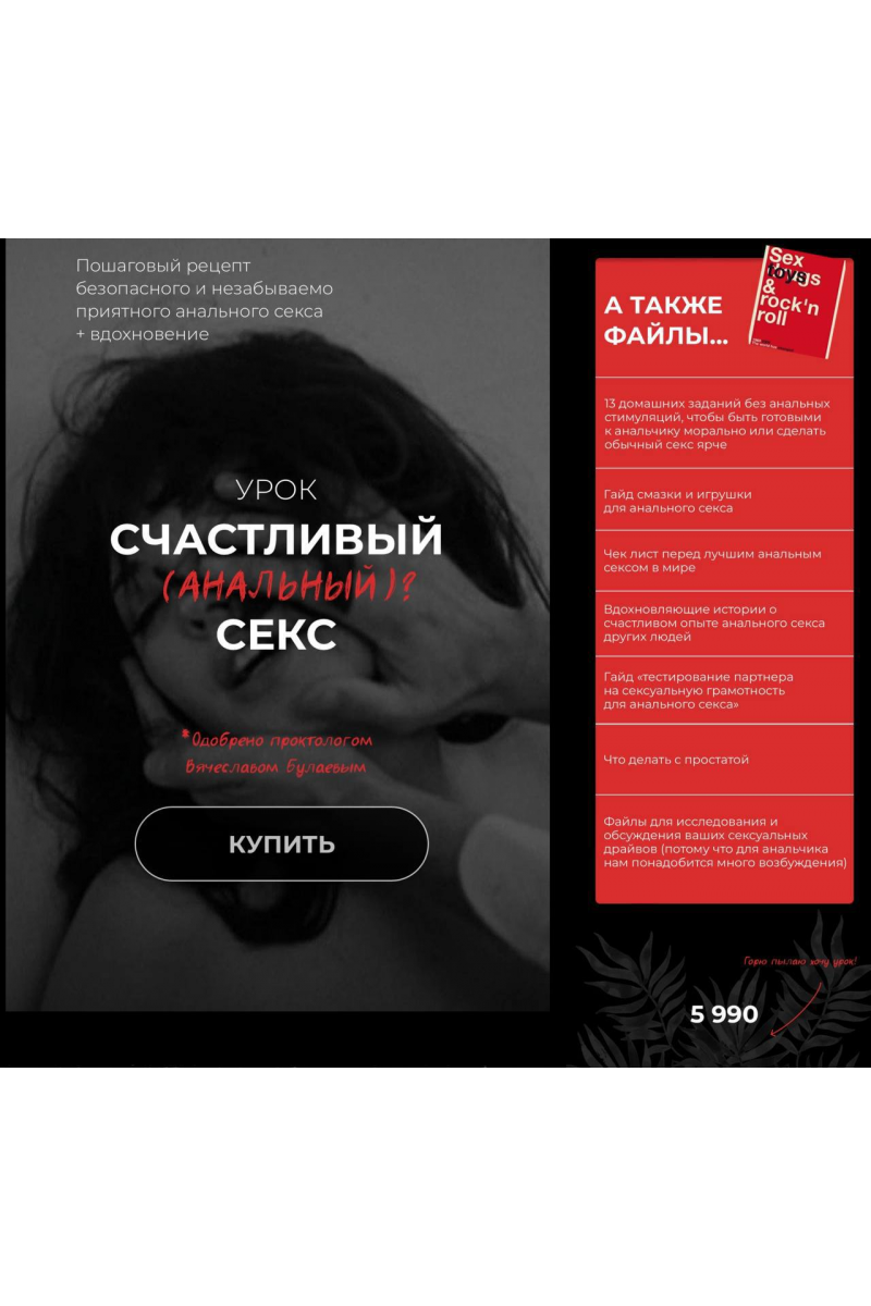 Почему это может (БЕЗУМНО) нравиться принимающей стороне?Доза вдохновения для неистового желания дать в попуКак сделать свой анальный секс максимально безопасным для здоровья?Где мифы и страшилки, а где правда?Как сделать так, чтобы не было больно?Как сделать так, чтобы было чисто?Как получить удовольствие и невероятный ни с чем не сравнимый опыт?Как подготовиться и расслабиться детально и разжёвано, техники, лайфхакиКак настроить себя и что делать после, подробный план действийЧто нормально, а что нет, что со может произойти, чего ждать, а чего ждать не стоитКак сделать проникающего партнера чутким, опытным, терпеливым, турбо заботливым, щедрым на любовь и прелюдии - идеальным для (анального)ceкса?13 домашних заданий без анальных стимуляций, чтобы быть готовыми к анальчикуморально или сделать обычный секс ярчеГайд смазки и игрушки для анального сексаЧек лист перед лучшим анальным сексом в миреВдохновляющие истории о счастливом опыте анального секса других людейГайд «тестирование партнера на сексуальную грамотность для анального секса»Что делать с простатойФайлы для исследования и обсуждения ваших сексуальных драйвов(потому что для анальчика нам понадобится много возбуждения)