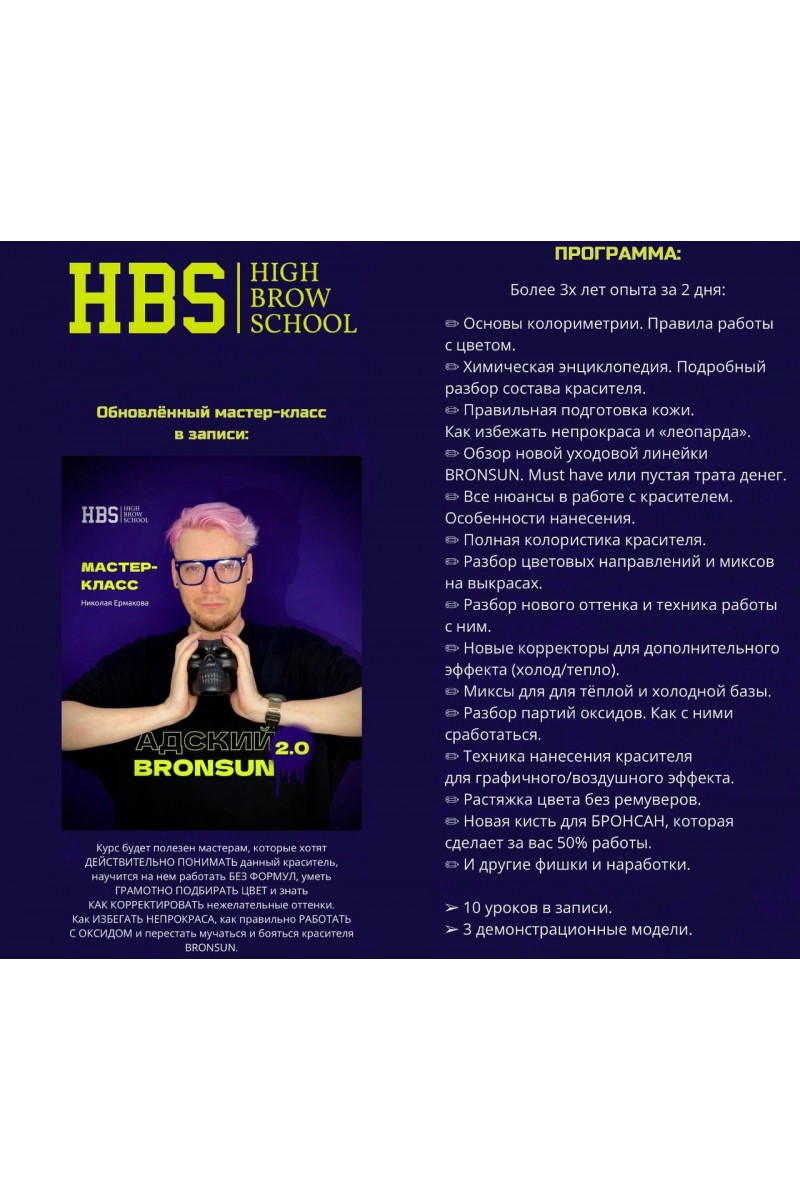 ПРОГРАММА:Более 3х лет опыта за 2 дня:︎ Основы колориметрии. Правила работы с цветом.︎ Химическая энциклопедия. Подробный разбор состава красителя.︎ Правильная подготовка кожи. Как избежать непрокраса и «леопарда».︎ Обзор новой уходовой линейки BRONSUN. Must have или пустая трата денег.︎ Все нюансы в работе с красителем. Особенности нанесения.︎ Полная колористика красителя.︎ Разбор цветовых направлений и миксов на выкрасах.︎ Разбор нового оттенка и техника работы с ним.︎ Новые корректоры для дополнительного эффекта (холод/тепло).︎ Миксы для для тёплой и холодной базы.︎ Разбор партий оксидов. Как с ними сработаться.︎ Техника нанесения красителя для графичного/воздушного эффекта.︎ Растяжка цвета без ремуверов.︎ Новая кисть для БРОНСАН, которая сделает за вас 50% работы.︎ И другие фишки и наработки.10 видеозаписей.3 демонстрационные модели.Без бонусов.