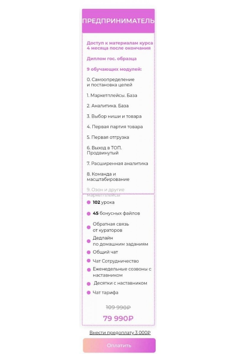 Ваш результат через 9 недельНОВИЧКАМОсвоенная профессия менеджера маркетплейса с зарплатой от 50 000₽ за одного клиента, первые заработанные деньгиСПЕЦИАЛИСТАМ ПО МАРКЕТПЛЕЙСАМИзбавились от комплекса самозванца, сделали и упаковали кейсы, повысили свой чек и выбрали зону ростаРАБОТАЮЩИМ В НАЙМЕОсвоили навыки, которые позволяют зарабатывать на маркетплейсах, нашли новые способы заработка и работаете онлайнПРЕДПРИНИМАТЕЛЯМВышли на маркетплейс, сформировали команду и получили первые продажи