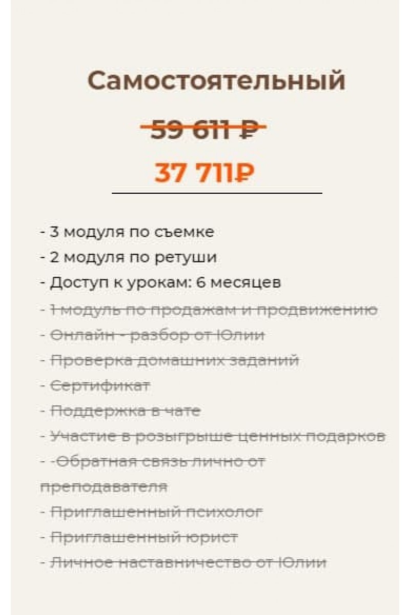 Об авторе курса:Привет! Меня зовут Юля Бездарь, и я - практикующий фотограф с 5 - летним стажем. Благодаря фотографии я:Начала путешествовать и побывала в более чем 30 странахПереехала из Новокуйбышевска в собственную квартиру в СочиС первого года работы фотографом вышла на заработок 300 тыс. рублей в месяцРаботаю с различными известными брендами, блогерами имоделямиЗанимаюсь любимым творческим делом, от которого у меня горятглазаХочешь так же?Вы планируете сделать первые шаги в профессии, но не понимаете, как настроить камеру, как работать с моделью и где искать клиентов.Вы уже кое-что умеете, снимаете и обрабатываете фото, но недовольны своим заработком и хотите выйти на новый уровень.Вы понимаете, что не живёте жизнью своей мечты, хотите освоить творческую профессию и вырваться из серых будней.Узнаете, как правильно настраивать камеру для различных условийПоймёте, как подбирать модель на съёмку, локацию и реквизит для получения крутого результатаНаучитесь основам фотографии, сможете видеть кадрМой авторский курс подойдет:НовичкамФотографамТворческим людямЯ знаю, что вам сейчас страшно.Страх - это нормальная реакция на качественные изменения в жизни.Сейчас вы боитесь:Своей неопытности. «Я совсем не умею снимать и не уверен, что у меня получится!». Наш курс - практический, и если вы будете выполнять все задания, то не начать снимать и пополнять портфолио будет просто невозможно!Осуждения со стороны близких и друзей. Мы знаем, что это такое - начинать без одобрения со стороны родных. На курсе вы получите мощную поддержку от единомышленников.Не найти клиентов. Да, мой курс - не волшебная таблетка и он не приведёт клиентов просто так. Ваш заработок и то, как вы примените полученные знания, - в ваших руках. Я гарантирую качественное обучение, а вы должны будете приложить усилия, чтобы получить крутой результат.Высокой конкуренции. Ведь фотографов так много! Да, но ведь это не мешает мне быть «той самой Юлей Бездарь»? Найдите свой авторский почерк, обучитесь продвижению личного бренда, и скоро клиенты начнут приходить к вам сами! А мы на курсе вам в этом поможем.Нестабильности. Фотография хороша своей многогранностью: если поначалу у вас будет недостаток в клиентах, вы всегда сможете зарабатывать ретушью, изучению которой посвящён отдельный модуль. Хорошие ретушёры всегда востребованы!