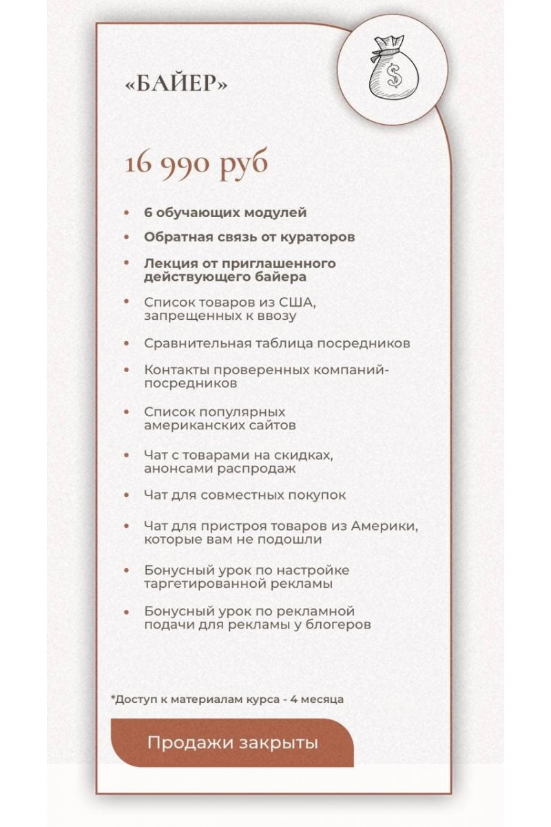 ДЛЯ КОГО КУРС?Студентам, которые хотят свой доходМамам в декрете, кто хочет зарабатывать от 50 000 руб., тратя на работу пару часов в день и уделять время семье и ребенкуФрилансерам, кто хочет зарабатывать стабильно и легко от 150 000 руб. в месяцТем, кто хочет свой бизнес и личный доход от 300 000 руб. в месяцТем, кто хочет перейти от закупок из Китая на бренды из Америки и зарабатывать от 400 000 руб. в месяцТем, кто хочет иметь дополнительный доход 50 000-150 000 руб. в месяцЧТО ВНУТРИ КУРСА?1. Пошаговое обучение: вы узнаете все тонкости заказа товаров в США, транспортировки, растаможкии продажи2. 7 модулей и более 35 уроков3. Лекции от приглашенных спикеров: от действующего байера и владельца офлайн-магазина, где они поделятся своим реальным опытом4. К каждому уроку бонусные материалы5. Сообщество единомышленников: закрытый чат в Telegram, в котором можно получить моментальную обратную связь от кураторов и других участников6. Ответы на вопросы от кураторов и лично от экспертаЧТО ВЫ ПОЛУЧИТЕ В РЕЗУЛЬТАТЕ:Будете знать все подводные камни и тонкости работы с американскими интернет-магазинами и перестанете совершать типичные ошибки, заказывая бренды из США (товары, которые можно купить в Америке за 20 000 ₽ в России продаются за 200 0000 ₽)Получите пошаговый план, как стать байером (помогать другим выкупать товары из Америки и зарабатывать без вложений от 50 000 ₽ в мес.) или открыть интернет-магазин и зарабатывать от 100 000 ₽ в месяцНаучитесь экономить на таможенных платежах и доставке товаров из АмерикиСможете покупать бренды из Америки по самым низким ценам (оригинальные сумки Michael Kors за 5000 ₽)ПРОГРАММА КУРСА:1 модуль: Как заказывать товары из Америки— Особенности работы с США— Шопинг в США: как покупать товары в Америке— Покупаем выгодно: как покупать легально и не платить налоги— Таможенные ограничения: как застраховаться от конфискацииБонусы:— Список товаров из США, запрещенных к ввозуВ результате:1. Узнаете, в чем особенности работы с Америкой2. Получите пошаговый план запусков в США2 модуль: Алгоритм взаимодействия с посредниками— Анализ посредников— На что обращать внимание при выборе компании-посредника— Как не нарваться на мошенников— Компании-посредники: пошаговый план, как работать с посредниками— Регистрация: инструкция, как зарегистрироваться на сайте посредника— Таможенное оформление товара: как избежать проблем с таможней— Формирование посылки: как выгодно собрать посылкуБонусы:— Сравнительная таблица посредников— Контакты проверенных компаний-посредниковВ результате:1. Узнаете контакты надежных посредников2. Научитесь правильно заполнять таможенную декларацию3. Сможете объединять заказы и отправлять их оптимальными по весу и цене, чтобы не платить таможенные сборы3 модуль: Работа с сайтами и дополнительные выгоды— Обзор сайтов: популярные американские интернет-магазины— Закрытые сайты: как получить доступ к сайтам, которые не работают с вашей страной— Регистрация на сайтах: как получить максимум бонусов и привилегий— Выбор товара: как правильно настроить фильтры— Распродажи: где искать лучшие скидки на товары— Выбор размера: как не ошибитьсяБонусы:— Список популярных американских сайтов— Чат с товарами на скидках, анонсами распродажВ результате:1. Поймете, как регистрироваться на «недоступных» сайтах2. Получите информаци
