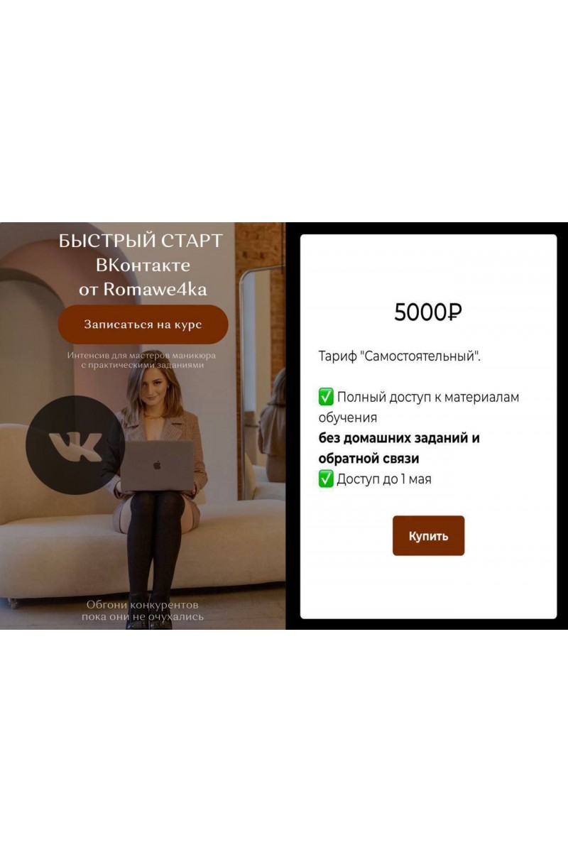 Для тех кому требуется помощь разобраться во Вконтакте, я решила создать не курс, а практикум по этой социальной сети. Т е уроки+домашние задания, всего 8 штук.1 урокСоздание страницы. Выбор удачной категории для мастера, название, описание, тематика, настройки.+ Домашнее заданиеВизуал. Продающее оформление страницы, аватар, обложка, разделы, адрес.+Домашнее задание3 урокКонтент-план. Алгоритмы публикаций Вконтакте. Тексты и темы постов.+ Домашнее заданиеФото контентФотографии для ленты, создание альбомов раскрывающие ценность услуг, оформление прайса Зачем вообще это надо?+ Домашнее заданиеВидео контент. Съёмка видео, монтаж, публикация, клипы.+ Домашнее заданиеИстории. Как записывать истории, сколько в день, что снимать, что публиковать, как привлечь внимание и повысить запись клиентов? Функционал инструмента+ Домашнее заданиеПродвижение. Воронка продаж, упаковка страницы, платные и бесплатные методы продвижения. + Домашнее заданиеПрямые эфиры. Как подготовиться к эфиру, чтобы не «облажаться»? Цель эфира, поэтапный сценарий, идеальный результат. Актуально для всех, кто планирует преподавать или уже преподаёт курсы. +Домашнее задание
