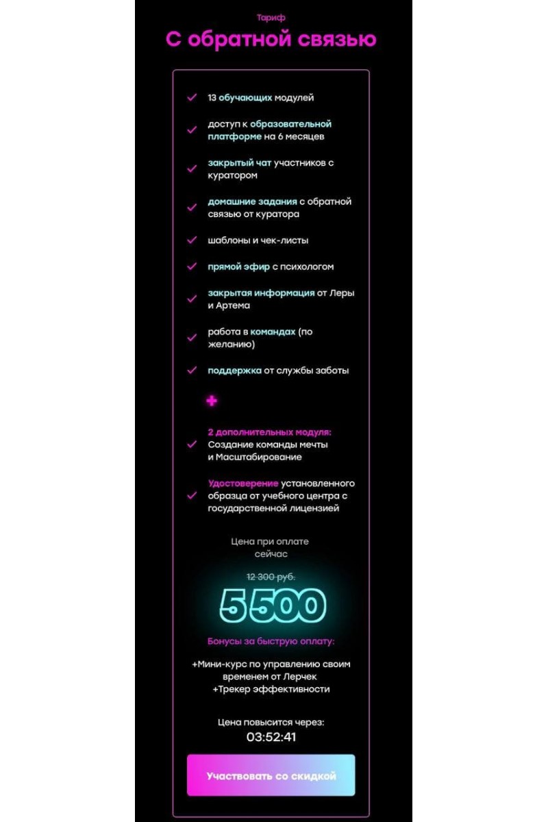 Сферы жизниСвернуть модульКакие сферы жизни существуют, и как определить приоритетные для себяАнализ текущей ситуации (точка А)Представление желаемого результата (точка Б)Как получать результат в нескольких сферах и не выгоратьРезультат модуля:Правильно определите свою точку А (где вы находитесь сейчас) и желаемую точку Б по всем сферам жизни. Ответите себе на вопрос «А чего я хочу на самом деле?» и подготовите почву для того, чтобы это появилось в вашей жизни.3 модульСекретные методыизбавления от страхови сомнений -5 работающих техник4 модульПредназначениеПошаговый алгоритм:как найти своё предназначениеПлан по распаковке своих талантовВаши активы - поймете, на чем вы можете зарабатывать уже с завтрашнего дняТочки утечки финансов - сколько денег вы теряете, и как этого избежатьРезультат модуля:Сделаете первые шаги в раскрытии своего предназначения, определите свои активы и посчитаете, сколько денег на них можно зарабатывать уже сейчас именно вам.Бонус: шаблон по распаковке личности5 модульВыбор дела6 модульПервые деньги7 модульОкружение как инструмент для поиска клиентов8 модульКак не бояться конкурентов и быть на шаг впереди нихМаршрутная карта -внедрение инструментов в жизнь9 модульСекреты Лерчек, как оформить и вести Инстаграм, чтобы он приносил клиентов— 1 частьИнстаграм. Блогеры и Таргет10 модульСекреты легких продаж:Как продавать, не продавая11 модульСпособы поиска клиентов12 модульФормула для увеличения прибыли в короткие сроки13 модульТехнология составления плана действий: как сохранить и преумножить результат после обученияКак правильно поставить цель на следующий месяцКак составить себе пошаговый план дальнейшего развитияРезультат модуля:Завершите марафон не только с крутыми результатами, но и конкретным планом действий на будущее