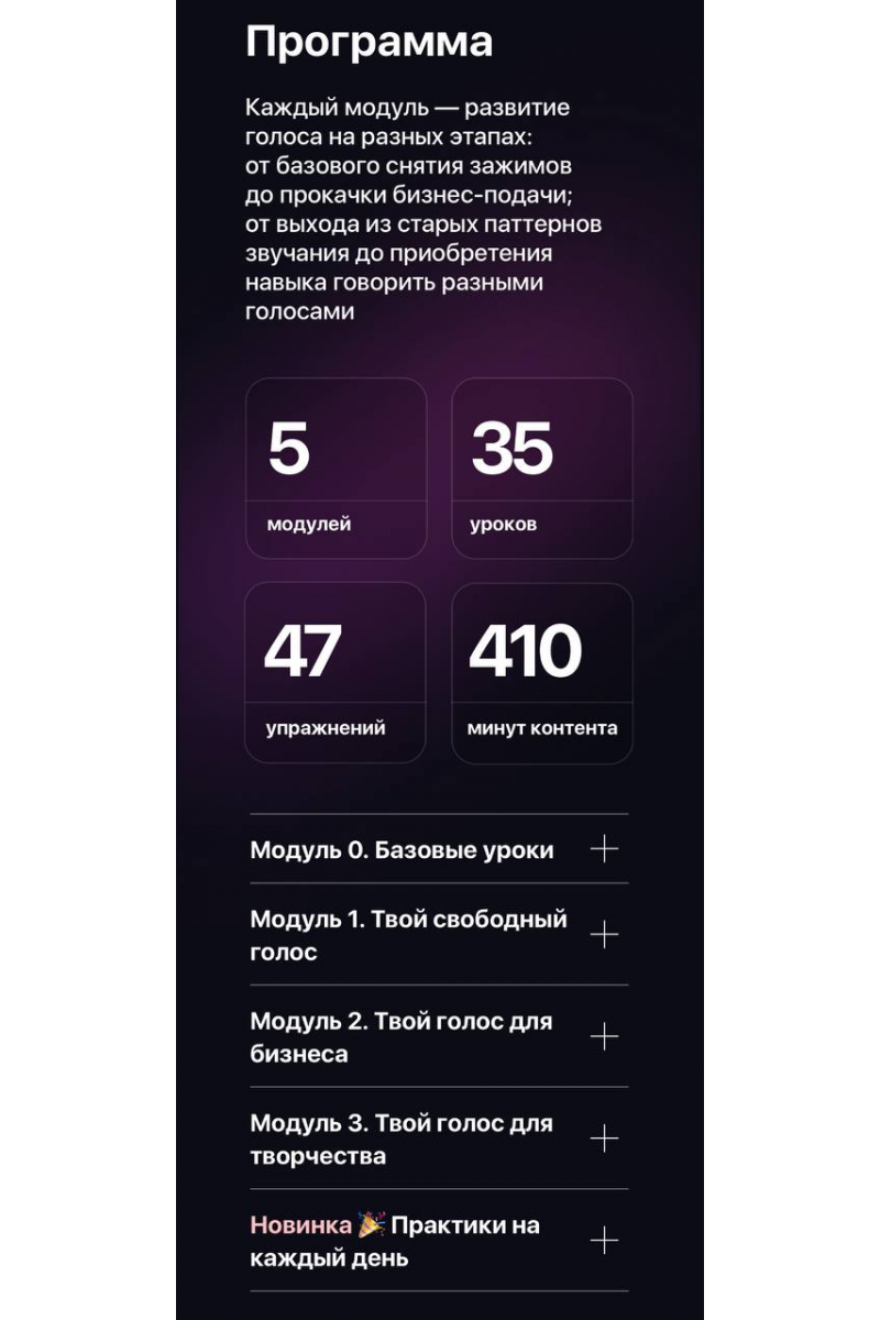 Голос – новый уровень твоего профессионализмаУправляй инструментом, который сделает тебя притягательным, уверенным и заметнымРечь – индикатор твоей стоимостиГовори на языке нужной аудитории, отстраивайся от конкурентов и повышай чек на свои услугиУпражнения, которые становятся образом жизниБез заезженных скороговорок и пробок во рту. Только упражнения, которые хочется повторятьЭтот курс для тебя, еслиТы часто замечаешь у себя ком в горле, сдавленность в груди, пересохшее горло, нервный кашельТы чувствуешь, что, изменив свой голос и подачу, сможешь выйти на новый уровень в общении и работе.Тебе тяжело даются новые знакомства и полезные связи, а нетворкинг часто оказывается непродуктивным.Ты эксперт в своей области, но почему-то у тебя не берут интервью, не приглашают на конференции, не зовут на ТВ.Ты всегда хотел начать вести свой подкаст, видео-проект, петь, озвучивать фильмы и работать с голосом.Ты всегда мечтал научиться говорить так же чётко, красиво и уверенно, как телеведущие. Считай это знаком свыше.ПрограммаМодуль О. Базовые урокиМодуль 1. Твой свободный голосМодуль 2. Твой голос для бизнесаМодуль 3. Твой голос для творчестваПрактики на каждый деньПрямые эфиры:1. Как начать звучать по-новому2. Формула вирусных видеоДополнительно:1. Практика по раскрепощению2. Практика по эффективным коммуникациям3. Урок по публичным выступлениям в стиле TEDМастер-классы