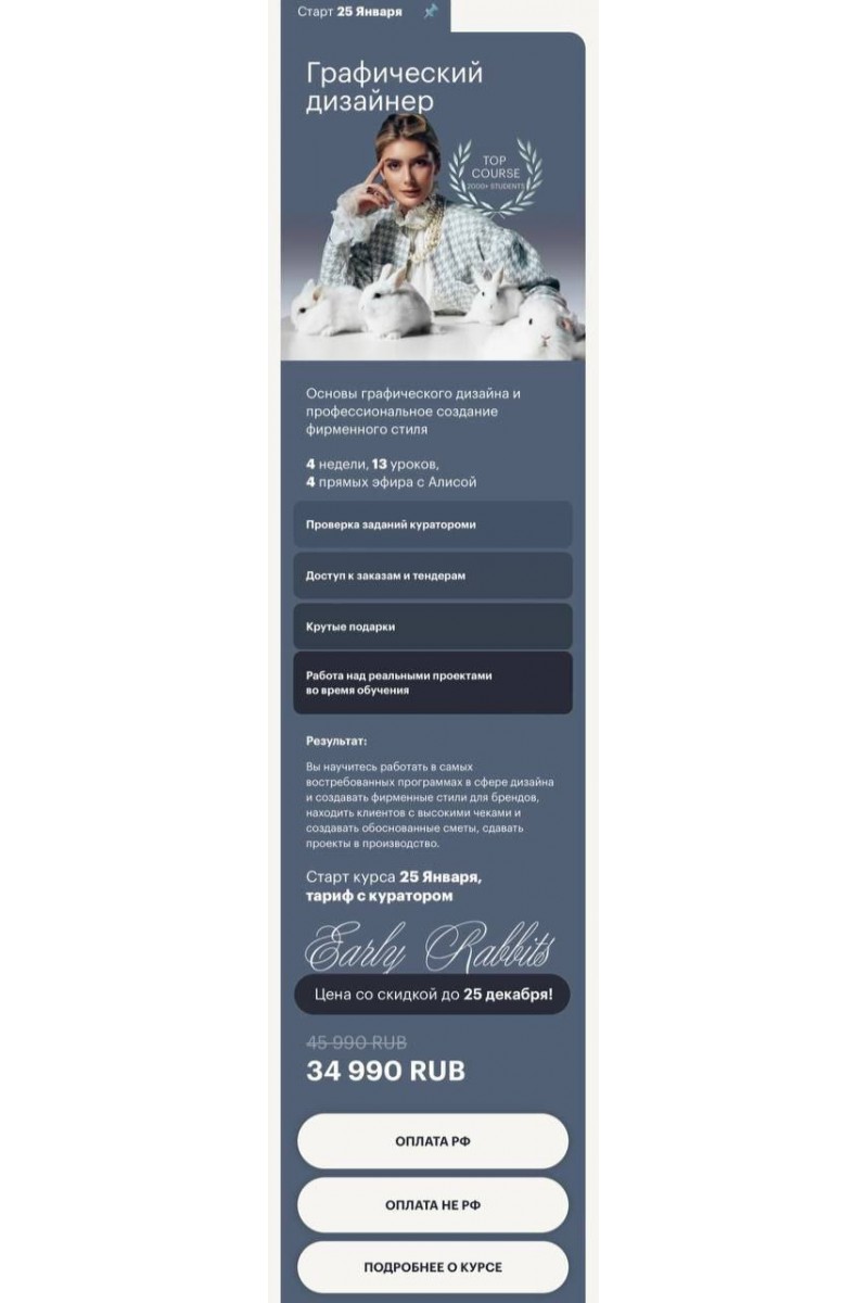 Основы графического дизайна и профессиональное создание фирменного стиляРезультат:Вы научитесь работать в самых востребованных программах в сфере дизайна и создавать фирменные стили для брендов, находить клиентов с высокими чеками и создавать обоснованные сметы, сдавать проекты в производство.Тариф Графический дизайнер4 недели, 13 уроков,4 прямых эфира с Алисой