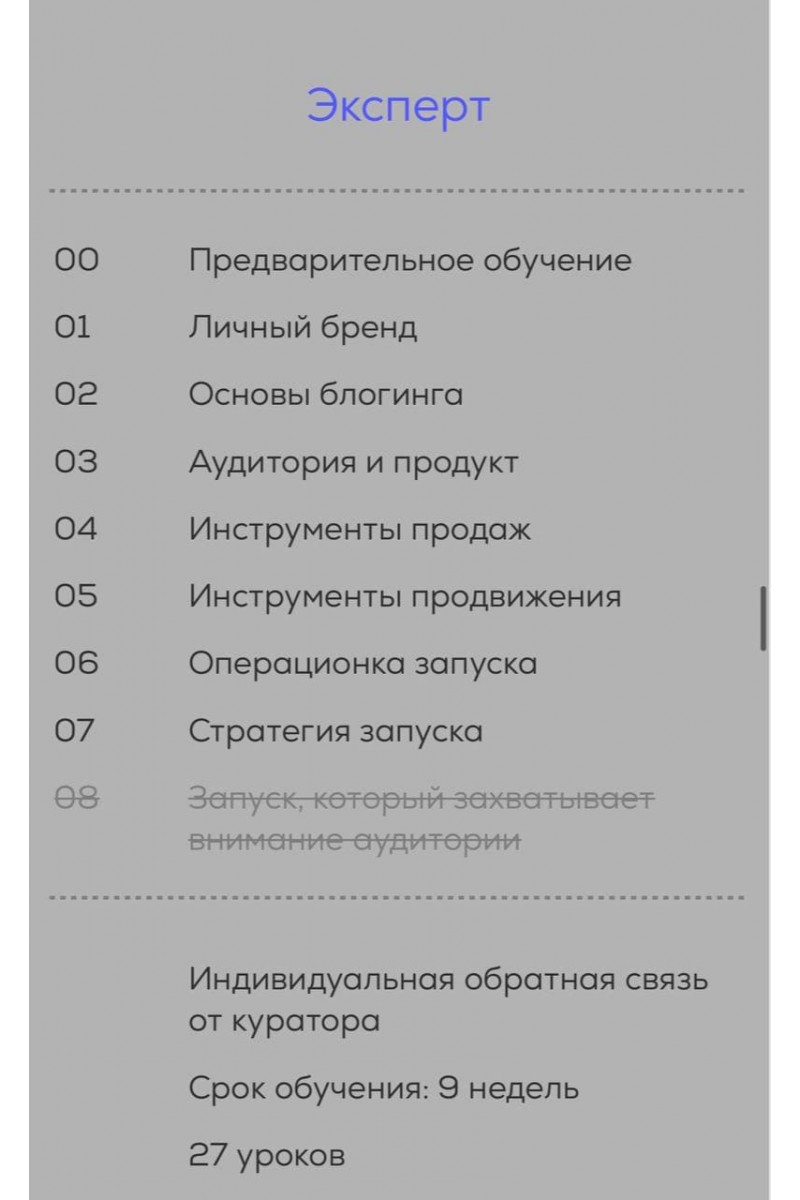 Курс по блогингу, продажам и запускамТариф - ЭкспертПрограмма курса:Личный брендПредварительное обучениеОсновы блогингаАудитория и продуктИнструменты продаж и продвиженияСтратегия запуска27 уроков