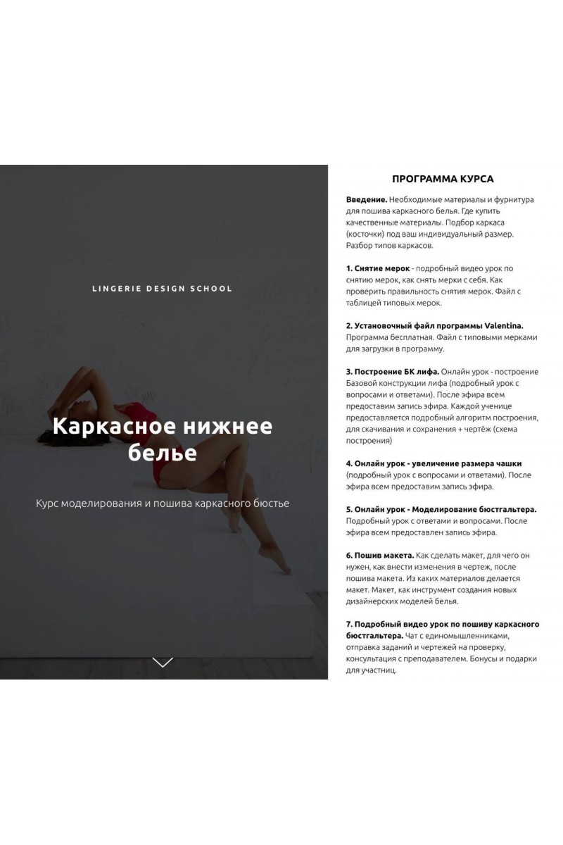 ПРОГРАММА КУРСАВведение. Необходимые материалы и фурнитура для пошива каркасного белья. Где купить качественные материалы. Подбор каркаса (косточки) под ваш индивидуальный размер. Разбор типов каркасов.1. Снятие мерок - подробный видео урок по снятию мерок, как снять мерки с себя. Как проверить правильность снятия мерок. Файл с таблицей типовых мерок.2. Установочный файл программы Valentina. Программа бесплатная. Файл с типовыми мерками для загрузки в программу.3. Построение БК лифа. Онлайн урок - построение Базовой конструкции лифа (подробный урок с вопросами и ответами). После эфира всем предоставим запись эфира. Каждой ученице предоставляется подробный алгоритм построения, для скачивания и сохранения + чертёж (схема построения)4. Онлайн урок - увеличение размера чашки (подробный урок с вопросами и ответами). После эфира всем предоставим запись эфира.5. Онлайн урок - Моделирование бюстгальтера. Подробный урок с ответами и вопросами. После эфира всем предоставлен запись эфира.6. Пошив макета. Как сделать макет, для чего он нужен, как внести изменения в чертеж, после пошива макета. Из каких материалов делается макет. Макет, как инструмент создания новых дизайнерских моделей белья.7. Подробный видео урок по пошиву каркасного бюстгальтера. Чат с единомышленниками, отправка заданий и чертежей на проверку, консультация с преподавателем. Бонусы и подарки для участниц