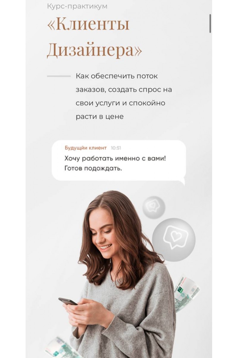 Курс-практикум для дизайнеров, которые испытывают трудности с поиском заказовНОВИЧКИНаучитесь использовать социальные сети как инструмент для продвижения и роста в профессииОПЫТНЫЕУсилите поток заказов, чтобы поднимать цены без страха потерять клиентовЗа 3 недели вы научитесь цеплять клиентов через социальные сети и показывать свою ценность как специалистаПо шагам вы создадите стратегию выхода на заказчиков, с которыми возможно эффективное сотрудничество и реализация вашего потенциалаЧто вас ждет:6 видеоуроковДомашние задания для отработки и закрепления знанийМозговые штурмыДополнительные материалыПрограммаУрок 1 «Как увеличивают продажи»1. Дизайн для души, бизнес для денег2. Бизнес-подход к развитию фрилансера3. Как увеличить количество заявок4. Как легче и больше доводить заявки до продажиУрок 2 «Выбираем идеальную аудиторию»1. Делать то, что нравится для тех, кто это оценит2. Секрет лёгких экологичных продаж3. Определяем свою силу4. Выбираем оптимальную аудиториюУрок 3 «Максимизируем выручку»1. Экологичный подход к высоким чекам2. Линейка услуг для стабильных продаж3. Профи: клиенты идут по вашему плану4. Эмоции + Факты = ПродажиУрок 4 «Упаковка продаёт»1. Клиент уверен, что выбирает профи2. Выжимаем максимум из каждого инструмента3. Разные площадки - системный подход4. Портфолио: витрина вместо складаУрок 5 «Контент продаёт»1. Четкий подход, как зацепить и убедить2. Истории и сюжеты: управление ценностью3. Публикации и статьи: метод сторителлинга4. Как видео-контент поможет развитиюУрок 6 «Инструменты продаж»1. Целый арсенал техник и методов2. Пассивные и активные продажи3. Пишем сильный оффер4. Выбираем из 12 каналов продаж
