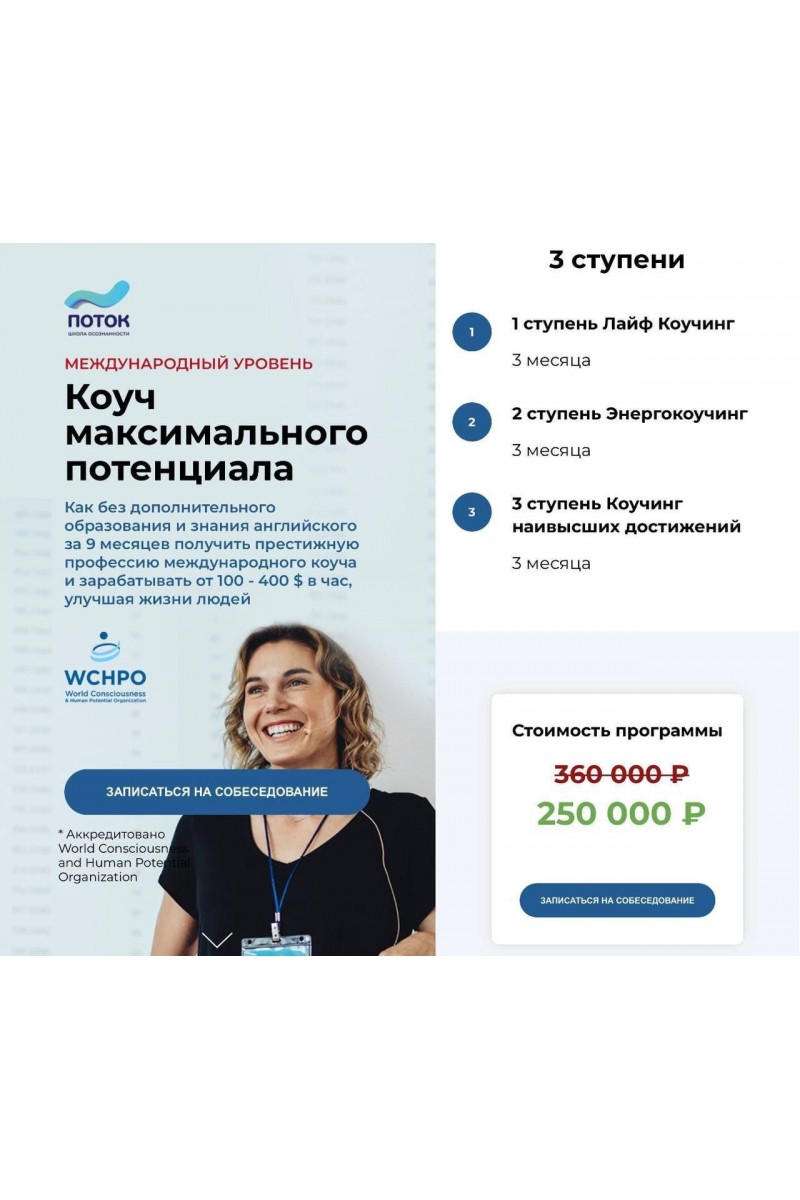 Как без дополнительного образования и знания английского за 9 месяцев получить престижную профессию международного коуча и зарабатывать от 100 - 400 $ в час, улучшая жизни людей.Твой доход меньше желаемого?Мечтаешь о свободном графике и работе на себя?Хочешь начать зарабатывать уже после 2 месяцев обучения?Хочешь сменить карьеру?Есть желание помогать людям?Нужна престижная и востребованная профессия?Возьми свой доход и своё будущее в свои руки с нашей международной сертифицированной программой подготовки Трансформационных коучей.Лайф-КоучЭнергокоучКоуч наивысших достиженийМетодика, которую вы освоите за 9 месяцев действует ошеломительно и даёт результат уже после первой сессии с Коучем максимального потенциала.Коуч максимального потенциала не только видит клиента насквозь, понимая все тенденции и ловушки ума, он разрывает все шаблоны и открывает внутреннего гения. Это невозможно с чем-то сравнить. Именно поэтому данные коучи всегда будут востребованы на рынке и их средняя зарплата $100-$400 в час.Программа курса:Подготовительные модули, включающие в себя:Биоэнергетика 1 ступеньМодуль 1Обучение базовым навыкам коучинга. Мы показываем, как структурировать свои сессии, как продавать свой коучинг, какие документы подписывать с клиентами, как вести их из сессии в сессию 3, 6 и более месяцев.Модуль 2-3Лайф-коучинг по международным стандартам. Вы освоите и отработаете следующие компетенции: состояние принятия, активного слушания, наблюдение, интуитивная выборка содержания, пробуждение осознанности на 4х уровнях.Модуль 4Энергетический коучинг по стандартам WCHPO. Работа с энергетикой человека, считывание информации с поля, приведение человека в точку Максимального потенциала на уровне энергетикиМодуль 5Коучинг Максимального Потенциала: вы освоите систему максимальных достижений, раскрытие гениальности, пробуждение осознанности на уровне духа.Вы научитесь работать с 80% всех человеческих проблем. Детальный разбор кейсов ситуаций.Модуль 6Построение бизнеса. Как коучу гарантированно зарабатывать от $3 500 в месяц.3 ступени:1 ступень Лайф Коучинг,3 месяца2 ступень Энергокоучинг,3 месяца3 ступень Коучинг наивысших достижений,3 месяца