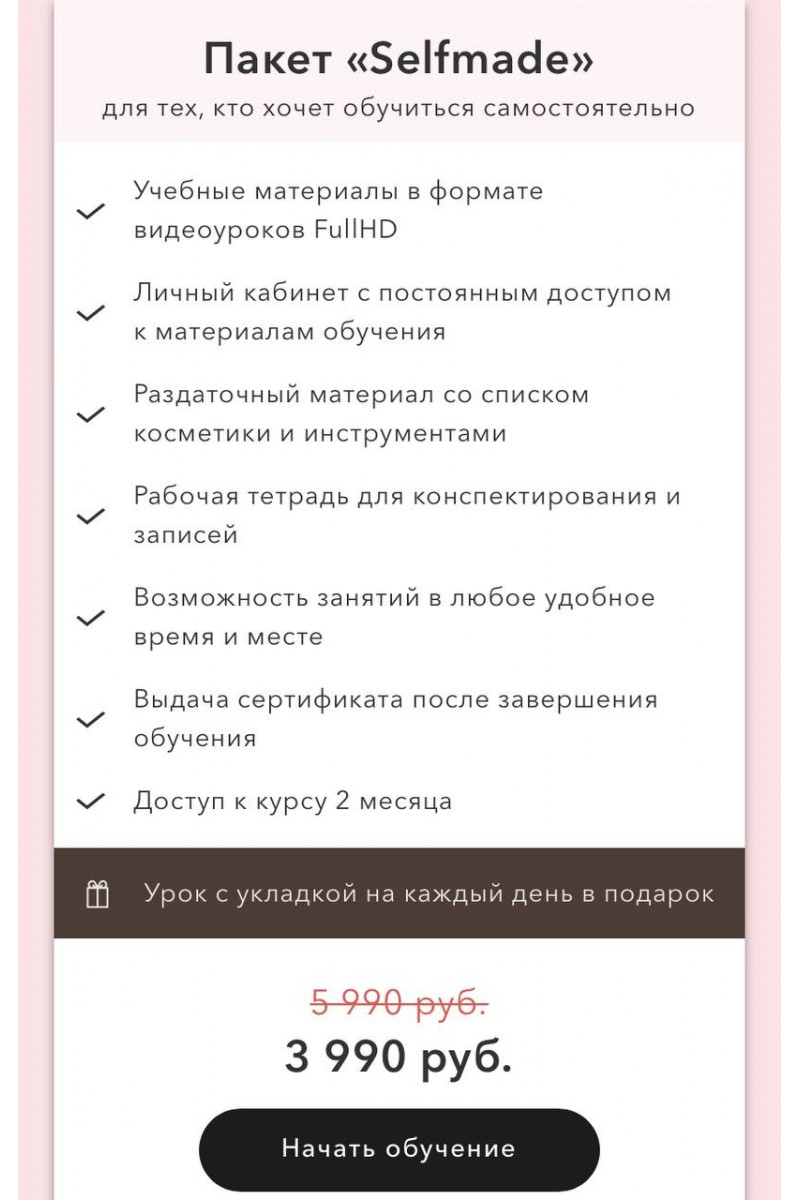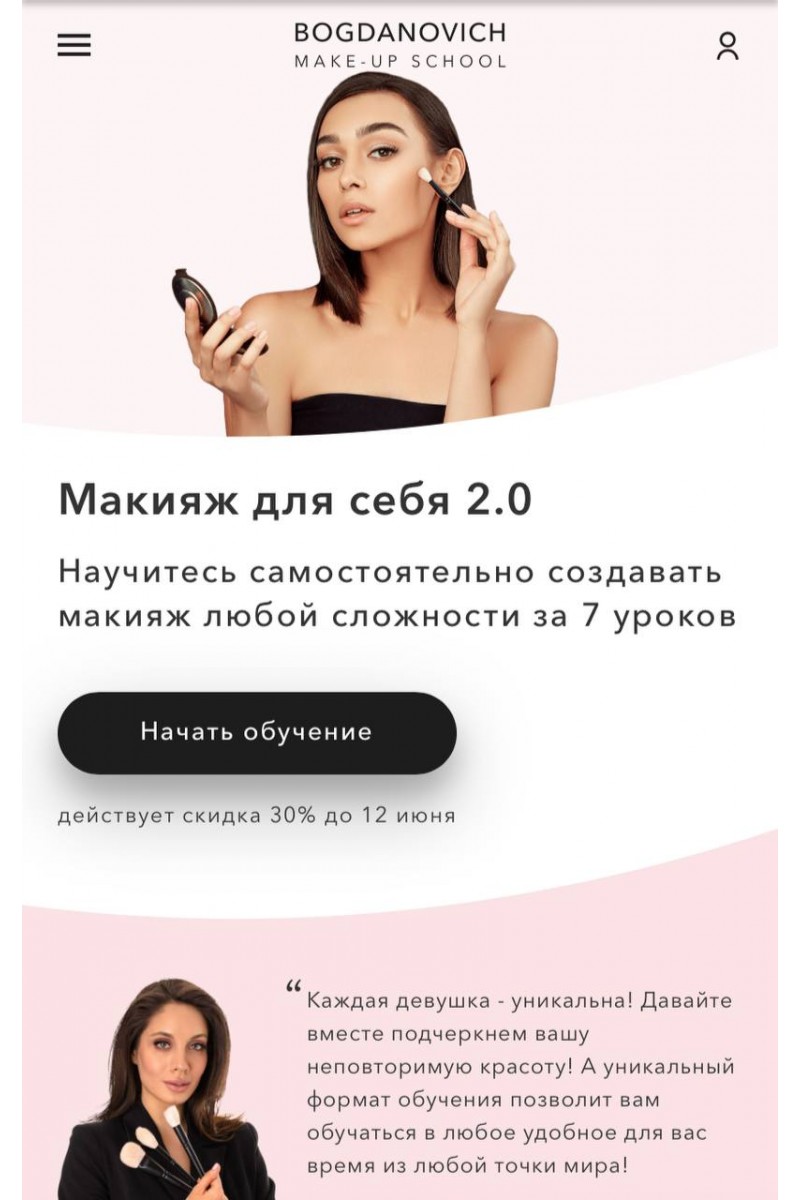 Качественная съемка с 2-х камер в FullHD форматеРаздаточный материал + рабочая тетрадь для более эффективного обученияПодробный материал «без воды» с упором на сложные элементы и часто задаваемые вопросыПройдя курс вы:Разберетесь во всём многообразии косметических средствСамостоятельно реализуете свой идеальный вариант макияжаСможете создавать образ на любое мероприятие без траты денег на визажистаПрограмма курса:Теория. Все о подготовке кожи к макияжуВводная часть. Типы кожиГрамотный уход и идеальная подготовка кожи к макияжуДекоративные базы - незаменимый продукт или маркетинговый ход?Косметика. Основные принципы подбора продуктовПодробный обзор лучших и незаменимых продуктов для базовой косметичкиПошаговое руководство по самостоятельному выбору косметикиДемонстрация и обзор продуктов из разных ценовых сегментовИнструменты для макияжа. Цветовой кругСамые необходимые кисти в макияже для себяГид по формам, ворсу и фирмам производителямГрамотный уход без вреда для кистейЧто такое цветовой круг? Как применять знания о цветовых сочетаниях в макияже?Идеальный сияющий Nude. Макияж на каждый деньСовершенная кожа - главный акцент повседневного макияжаЭффект второй кожи, секреты и фишки работы с тономМягкие линии и лифтинг эффект. Контурирование от А до ЯСамая актуальная техника оформления бровейИдеальный и универсальный макияж глаз на каждый деньМягкий и выразительный Smoky EyesОсобенности работы с тоном в макияже Smoky EyesВоздушные линии и выразительная коррекцияЧто такое идеальная подложка и формы в макияже глаз?Простая техника создания самого популярного макияжа глазУниверсальная цветовая схема и секреты работы с матовыми текстурамиСовременный вечерний макияж с акцентом на растушеванную стрелкуТехника и главные принципы работы с тоном в вечерних образахСекреты нанесения более плотной и интенсивной, но при этом естественной коррекцииПошаговая схема создания идеально растушеванной стрелкиОсобенности работы с яркими акцентами в макияжеСтрелки и яркие губы v2.0Активные скулы - прошлый век или главный элемент в коррекции?Чего стоит избегать в работе с тоном?Вариант стрелки, которая подходит любому типу глазТри простых шага в создании идеальной стрелкиКак грамотно вписать яркую помаду в образ?Ваш сертификатПодведение итогов и выдача сертификатаБонусный урок Простая укладка на утюжок за 15 минутСекреты подготовки волос к укладке на горячие инструментыЛучший стайлинг для домашнего использования, который сохранит вашу укладкуОсобенности и техника работы с утюжкомАктуальная укладка, которую сможет повторить каждаяКто ведет курсЕлена БогдановичПрофессиональный визажист. Основатель и преподаватель Bogdanovich Make-Up SchoolАлёна МорозоваПрофессиональный визажист. Преподаватель и куратор Bogdanovich Make-Up SchoolАлиса ПодашевскаяПрофессиональный визажист. Куратор Bogdanovich Make-Up SchoolИрина ЯниловаПрофессиональный визажист. Куратор Bogdanovich Make-Up School