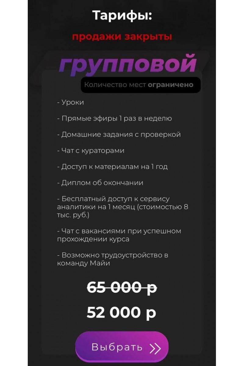 Освой востребованную профессию и стань «Менеджером по работе с маркетплейсами» за 2 месяцаПосле успешного прохождения курса вы сможете работать как одной из, так и всеми специальностями:Техническим специалистом поставщика мп (ВБ, Озон, Я.маркет, Алиэкспресс)Подготовка заказа к поставке, маркировка, наклейки, отгрузка, контент-стратегия, подготовка карточек товаров, работа с отзывами, вопросамиResearch managerспециалистом по поиску нишиАнализ конкурентов, просчёт себестоимости и ценообразования, расчёт вложений и окупаемости, привлечение инвестиций, использование сервисов аналитикиАnalytics managerспециалистом по аналитикеИзучение еженедельных отчетов, работа над увеличением продаж, тестирование гипотез, планирование производства/закупок и отгрузок, работа с рекламными каналами, стратегия продвижения, использование сервисов аналитикиМенеджером первой поставки и консультантом по маркетплейсамПроектная работа с запуском новых брендов на маркетплейсах, обучение поставщиков и их сотрудников по работе на МП, разовые консультации по вопросам работы с МП, составление стратегии продвижения для поставщиковТариф Групповой