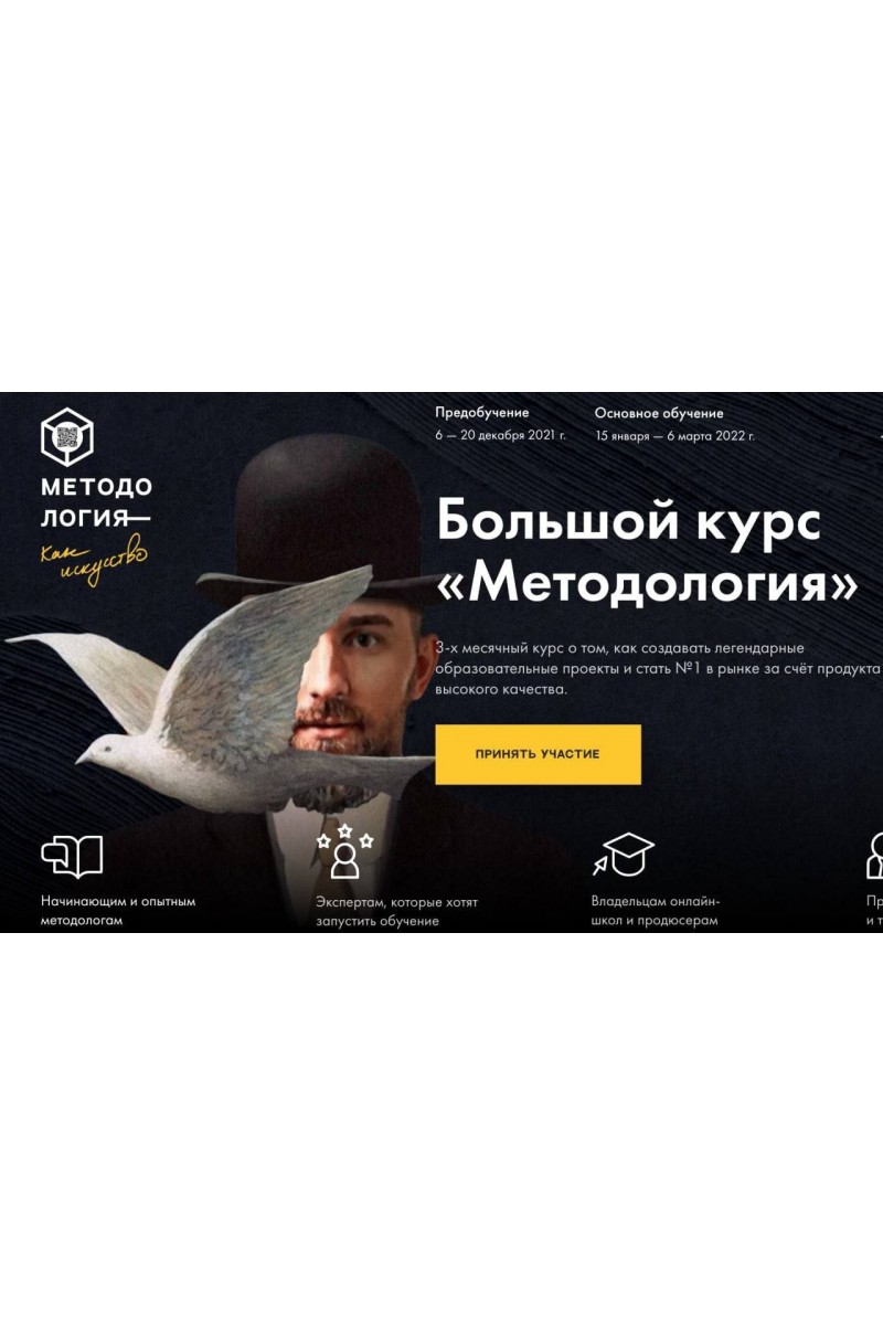 Курс «Методология» для тебя, если тыМетодологУпакуешь своё портфолио и найдешь высокооплачиваемые заказы внутри сообщества.ЭкспертСоздашь свой легендарный курс с нуля и сделаешь быстрый запуск MVP- версии.Владелец онлайн-школыПовысишь результативность учеников и повторные продажи своего курса.ПредпринимательСоздашь внутреннюю учебную программу или корпоративный университет для сотрудников.Тариф - Базовый•Доступ к обучающей платформе (12 основных обучающих модулей и 37 уроков)•Социальные динамики внутри курса•Биржа вакансий буткемпа 2.0•175 карточек смысловых приемов в электронном виде•Два эфира в формате вопрос-ответ от методологов•Эфиры «вопрос-ответ»•Банк дополнительных материалов•Трансляция 4-х дней живых занятий с Михаилом Дашкиевым и приглашенными спикерами