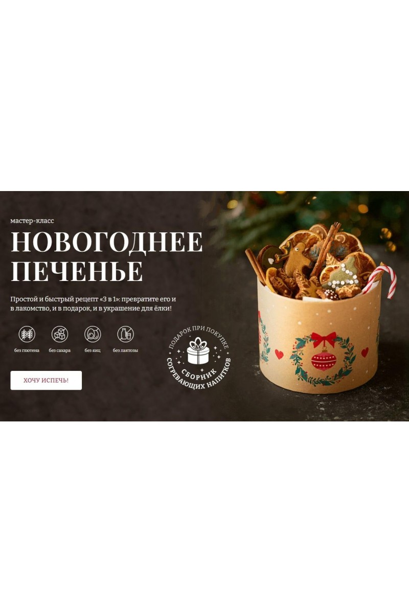 Вы получите:Видеоурок по приготовлению печеньяВидеоурок по приготовлению глазуриВидеоурок по росписи печеньяОсновные ингредиенты, из которых вы приготовите печенье:Безглютеновые виды мукиНатуральные подсластителиКокосовое маслоАквафабаСемена льнаСок и цедра цитрусовыхСпецииПодарок при покупке:Сборник согревающих напитков!