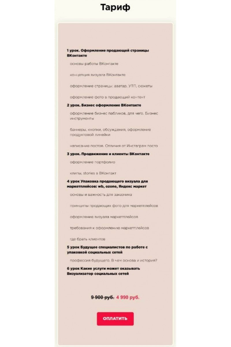 1 урок. Оформление продающей страницы ВКонтактеосновы работы ВКонтактеконцепция визуала ВКонтактеоформление страницы: аватар, УТП, сюжетыоформление фото в продающий контент2 урок. Бизнес оформление ВКонтактеоформление бизнес пабликов, для чего. Бизнес инструментыбаннеры, кнопки, обсуждения, оформление продуктовой линейкинаписание постов. Отличия от Инстаграм посто3 урок. Продвижение и клиенты ВКонтактеоформление портфолиоклипы, stories в ВКонтакт4 урок Упаковка продающего визуала для маркетплейсов: wb, ozone, Яндекс маркетосновы и важность для заказчикапринципы продающих фото для маркетплейсовоформление визуала маркетплейсовтребования к оформлению маркетплейсовгде брать клиентов5 урок Будущее специалистов по работе с упаковкой социальных сетейпрофессия будущего. В чем основа и история?6 урок Какие услуги может оказывать Визуализатор социальных сетей