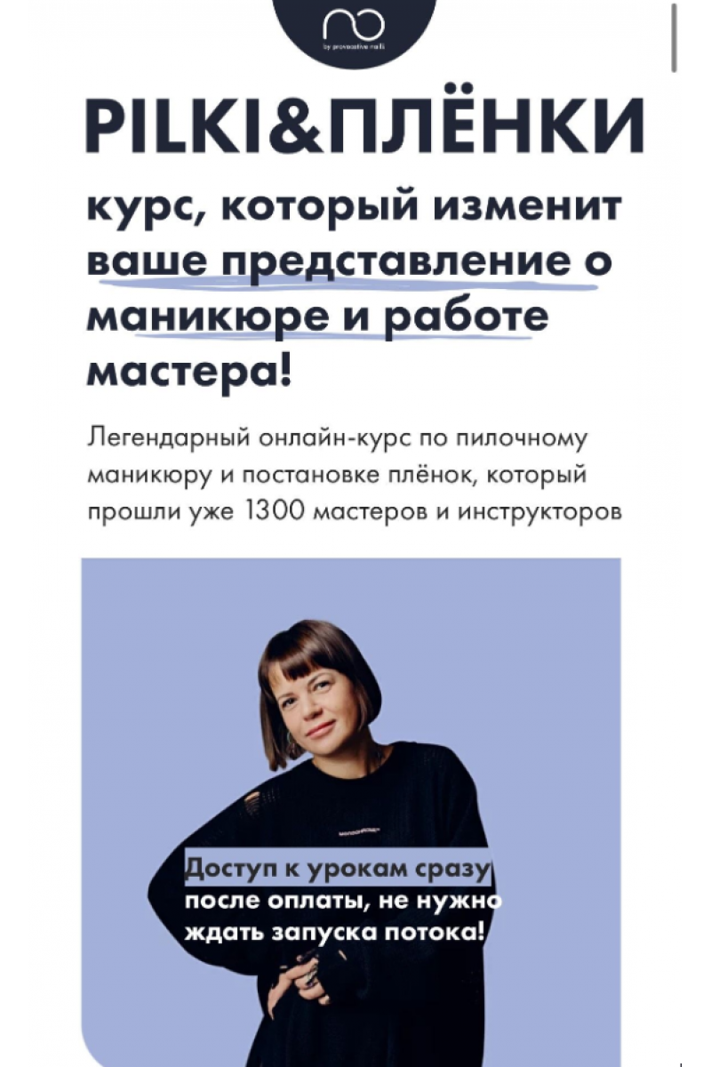 - Видео-уроки по теории пилочного маникюра - Видео-уроки по сложным случаям в пилочном маникюре на разных типах кутикул (на тонкой, резиновой, поврежденной, разросшейся, с высоким латеральным валиком, на мужских руках) - Детальные уроки по постановке пленок на разных типах ногтей и покрытий (миндаль, квадрат, балерина, с высокой продольной аркой, с высокой поперечной аркой) - 2 способа удаления пленок - Блок по СПА уходу (IBX, полировка ногтей, спа) - Блок из 5 лекций на тему "Как мастеру зарабатывать больше" (как увеличить продажи, набрать новых подписчиков, повысить цены, ввести новые услуги в прайс, +сценарии для сторис) - Шаблоны постов чтобы выстроить доверие и лояльность с аудиторией