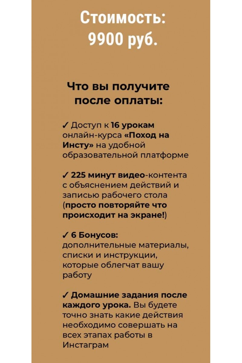 1 Исследуем идентичность и формируем образ профессионалаСначала вы исследуете свои сильные профессиональные и личные качества, ценности, особенности и интересы, чтобы в дальнейшем подсветить их нужным образом.В результате ваш блог будет отличаться, в вас будут видеть эксперта, людям будет интересно вас читать, а вам — приятно самовыражаться через Инстаграм.2 О чём писать, что говорить и что снимать в сторисСледующим шагом мы будем учиться транслировать свою идентичность и экспертность с помощью контента.Вы научитесь без труда писать посты и снимать сторис, которые день за днёмпривлекают новых подписчиков,демонстрируют ваши профессиональные особенности,повышают авторитет в глазах подписчиков и сообщества,помогают строить отношения с подписчиками, вовлекать их в диалог,продают ваши услуги и продукты3 Технический ликбезВ этом блоке вы освоите базовые настройки Инстаграм, найдёте информацию о встроенных функциях сторис и освоите несколько приёмов, которые помогут вам сделать свой аккаунт привлекательным и запоминающимся, даже если вы не дизайнер.4 Закладываем фундамент сильного личного брендаНачнём строить сильный бренд и научимся управлять вниманием и восприятием подписчиков. Вы станете куратором своего блога и с помощью продуманных акцентов научитесь целенаправленно формировать нужный нарратив.В результате процесс продвижения ваших идей и продуктов станет управляемым и интересным для вас самих.5 Оформляем профиль и готовим его к продвижениюВ этом блоке вы оформите свой профиль так, чтобы он выделялся, отражал вашу идентичность и продавал.Сделаете цепляющий аватарОформите шапку профиля так, чтобы поисковик Инстаграм показывал вас на первых позицияхКак «назвать корабль»: придумаете аккаунту такое имя, чтобы «плавание» было успешнымОформите хайлайтс и расскажете в них о себе и своих услугахОдна ссылка на все: научитесь использовать её грамотноПодберёте визуал ленты и сторис, который вас радует и отражает ключевые смыслы6 Привлекаем подписчиков с помощью таргетингаА дальше начнётся настоящая магия. Вы узнаете, как с помощью таргетированной рекламы набрать 1000 подписчиков за месяц (этого достаточно, чтобы начать получать клиентов). Причём, это будет не просто массовка, а люди близкие вам по духу, и действительно заинтересованные вашей темой.Никаких поднятий постов и прочих методов, впустую сливающих бюджет. Только то, что работает, и стоит недорого7 Как рекламироваться у блогеров, где их искать, как проверять, что писать и как оценивать результатыЕсли одного таргетинга вам покажется мало или не захочется разбираться в рекламном кабинете (хотя мы даём очень простой пошаговый план и показываем весь процесс), следующим шагом вы можете подключить блогеров к раскрутке вашего аккаунта.В этом блоке мы на пальцах покажем вам весь процесс и поделимся скриптами переписки с блогерами и каналами их поиска8 Шесть самых действенных бесплатных способов продвиженияСкажу сразу, что лично я не сторонница бесплатного продвижения, так как оно занимает много времени и приносит незначительный результат. Таргетинг по 100 рублей в день по моей системе работает намного лучше. Но если по каким-то причинам пока вы не хотите вкладывать деньги в рекламу и вам нужно набрать первую 1000 подписчиков – в этом разделе курса вы найдёте спос