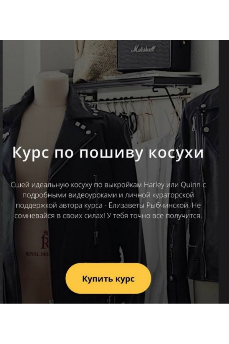 Сшей идеальную косуху по выкройкам Harley или Quinn с подробными видеоуроками. Не сомневайся в своих силах! У тебя точно все получится.Этот курс - отличная возможность не только сшить себе идеальную косуху, но и открыть для себя тонкости мастерства работы с кожей, которые ты сможешь применить в пошиве верхней одежды и не только. Курс состоит из 12 подробных видео-уроков, в которых детально разобраны все этапы пошива косухи.Программа:Рабочая тетрадь Harley QuinnУРОК 1. Раскрой подкладкиУРОК 2. Раскрой основного материала. ДублированиеУРОК 3. Сборка деталей пояса, погон и клапанаУРОК 4. Заготовка молнийУРОК 5. Сборка и втачивание карманаУРОК 6. Обработка и втачивание нижних кармановУРОК 7. Втачивание молнииУРОК 8. Соединение переда и спинкиУРОК 9. ШлёвкиУРОК 10. Обработка воротникаУРОК 11. Обработка рукавовУРОК 12. Подкладка. Финальная сборка