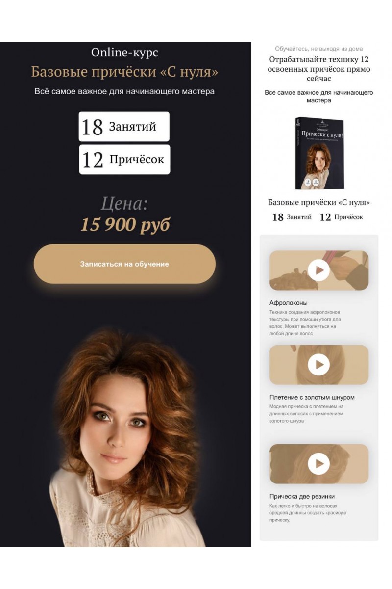 Онлайн-курс по созданию вечерних и свадебных причесок и стильных укладок на локонах разной длины.Курс рассчитан: на начальный и средний уровень подготовки.Что вы получите:18 видеоуроков по созданию 11 причесок.Уроки включают: файлы и видео-инструкции для отработки заданий на практике.О курсе:Благодаря данному курсу начинающие мастера:освоят основными навыками профессии;узнают все тонкости работы профессиональными инструментами;будут создавать новые прическиа профессионалы:поднимут свою квалификацию;достигнут нового уровня мастерства;узнают секреты Мастера по созданию ярких образов.Вы научитесь создавать афролоконы с применением утюжка, вплетать в прическу на длинных локонах золотой шнур, с помощью двух резинок формировать стильную прическу из волос средней длины.Сможете создавать неповторимые и сложные образы уже после прохождения всего 4-х практических уроков.1. Введение.2. Инструменты.3. Подготовка волос перед прической при помощи фена, щетки и брашинга. Основные средства для укладки.4. Подготовка волос перед прической при помощи утюга гофре "Volume Styler".5. Как собрать высокий хвост.6. Невидимки в работе.7. Высокая прическа с валиком.8. Секрет создания экспресс-прически на волосах средней длины. Пучёк с резинкой.9. Классическая накрутка на щипцы 25 диаметра.10. Накрутка при помощи утюга для волос. Создание "Афролоконов".11. Накрутка при помощи утюга для волос. Создание "Пляжных" локонов.12. Накрутка на щипцы "Вилка".13. Варианты техник плетения.14. Модная прическа с плетением на длинных волосах. С использованием шнура.15. Прическа на длинных волосах, плетение через шпильку.16. Экспресс-прическа создания низкого пучка без накрутки.17. Экспресс-прическа на волосах средней длины. С применением двух резинок.18. Вечерняя прическа с 5-ю сеточками.