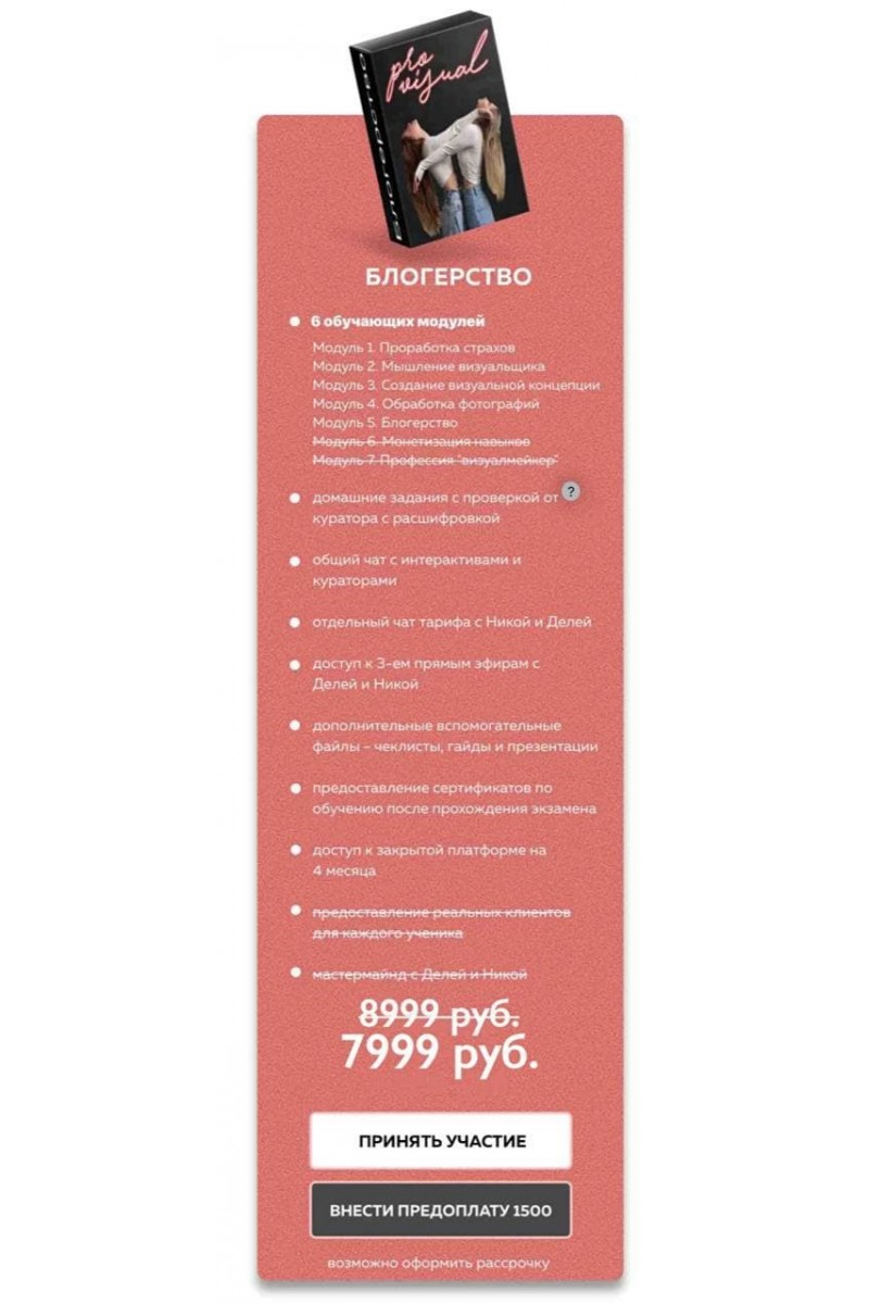 За 4 недели освой навык по созданию визуалов и начни зарабатывать на профессии визуалмейкера от 40 до 70 тыс. рублей в месяц.Программа:Модуль 1. Проработка страховМодуль 2. Мышление визуальщикаМодуль 3. Создание визуальной концепцииМодуль 4. Обработка фотографийМодуль 5. Блогерстводомашние задания с проверкой от куратора с расшифровкойобщий чат с интерактивами и кураторамиотдельный чат тарифа с Никой и Делейдоступ к 3-ем прямым эфирам с Делей и Никойдополнительные вспомогательные файлы - чеклисты, гайды и презентации