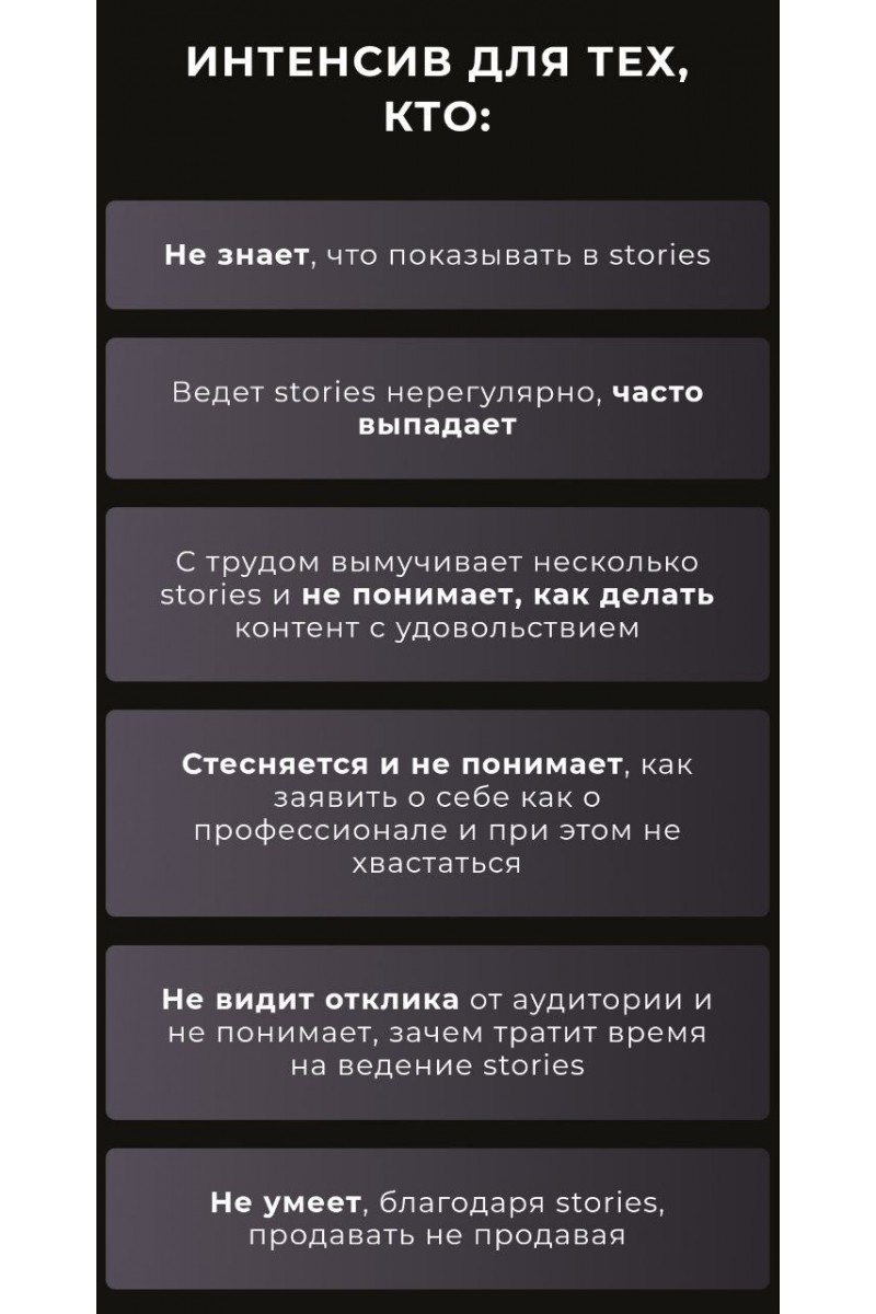 Интенсив для тех, кто:Не знает, что показывать в storiesВедет stories нерегулярно, часто выпадаетС трудом вымучивает несколько stories и не понимает, как делать контент с удовольствиемСтесняется и не понимает, как заявить о себе как о профессионале и при этом не хвастатьсяНе видит отклика от аудитории и не понимает, зачем тратит время на ведение storiesНе умеет, благодаря stories, продавать не продаваяНо хочет:Получить готовые шаблоны stories, которые принесут новых клиентовПродавать через stories ненавязчиво, но стабильно и многоПолучить быстрый результат в виде увеличения дохода без втюхивания и навязыванияНаучиться вести stories без страха и стыдаПолучить пинка и волшебной пыли от ЯровойОбрести поддержку и сильное окружениеПочувствовать удовлетворение от осознания, что все делает не зря и идет в верном направлении3 волшебных эликсира для вечного богатстваУрок 1.Сыворотка правды. Гарантирует:+ Распаковку личности, которая подарит вам идеи для контента на >90 дней вперед+ Навык генерации идей для stories без надрыва и в легкости+ Возможность не выпадать из stories+ Понимание, о чем говорить в stories, чтобы влюбить в себя потенциальных клиентовУрок 2. Зелье смелости. Подарит:+ Уверенность в себе, как в специалисте+ Умение рассказать о себе так, что клиенты предпочтут вас, а не конкурентов+ Возможность самому выбирать комфортный прайс, график работы и клиентов, а не соглашаться на все подрядУрок 3. Эликсир мудрости. Обеспечит вас:+ Талантом закрывать с помощью stories самые распространённые возражения «Дорого», «Может позже» и молчание+ Готовыми шаблонами для stories. Вам останется просто вставить свои данные и радоваться отклику от аудиторииБонусный урок в формате живого вебинара.+ Фразы, которые нужно сказать клиентам, чтобы они сразу же захотели купить+ Осознание ошибок в ведении stories, которые стоили вам клиентов+ Понимание, как превратить каждое действие в социальных сетях в золото
