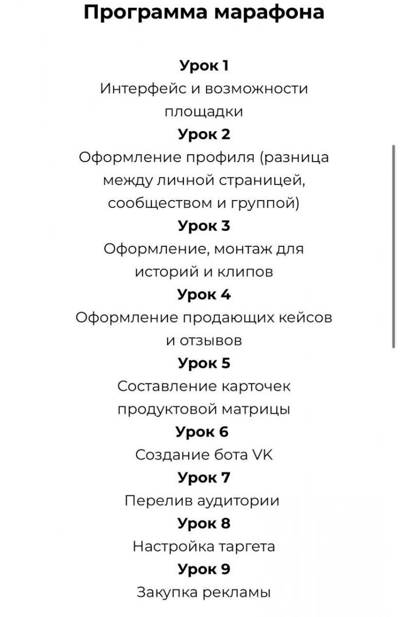 Программа марафона:Урок 1Интерфейс и возможности площадкиУрок 2Оформление профиля (разница между личной страницей, сообществом и группой)Урок 3Оформление, монтаж для историй и клиповУрок 4Оформление продающих кейсов и отзывовУрок 5Составление карточек продуктовой матрицыУрок 6 Создание бота VKУрок 7Перелив аудитории Урок 8Настройка таргетаУрок 9Закупка рекламы