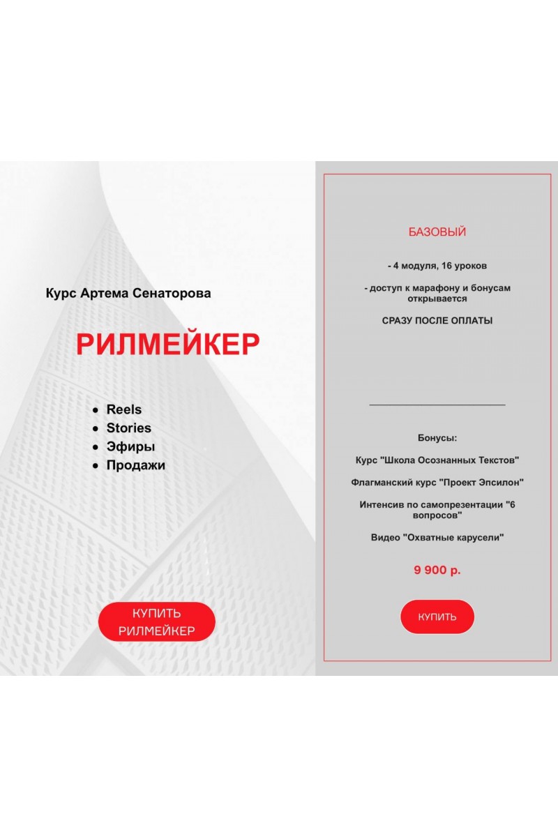Курс Рилмейкер Артёма Сенаторова:ReelsStoriesЭфирыПродажиПрограмма курса:Модуль 1. Подготовка аккаунтаУрок 1. ВведениеУрок 2. Вопрос, который меняет всеУрок 3. 3 главных мысли, которые должны быть в вашей шапкеУрок 4. АватаркаМодуль 2. СтратегияУрок 1. Что делаем? Набор правил.Урок 2. Банк идейУрок 3. Техническая подготовкаУрок 4. Оформление роликовМодуль 3. Конструктор сценариевУрок 1. ЗаголовкиУрок 2. ХукУрок 3. Призыв к действиюУрок 4. КодаМодуль 4. Продвинутые техникиУрок 1. Форматы видеоУрок 2. ВоронкаУрок 3. ПродуктУрок 4. Что дальше?Тариф Базовый:- 16 уроков в записиБонусы:Курс "Школа Осознанных Текстов"Флагманский курс "Проект Эпсилон"Интенсив по самопрезентации "6 вопросов"Видео "Охватные карусели"