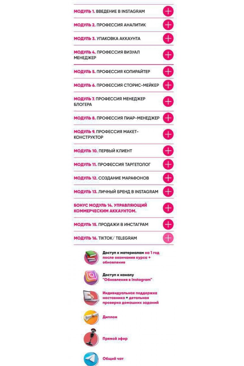 Модуль 1. Введение в InstagramМодуль 2. Профессия аналитикМодуль 3. Упаковка аккаунтаМодуль 4. Профессия визуал менеджерМодуль 5. Копирайтер Модуль 6. Профессия сторисмейкерМодуль 7. Профессия менеджер блогераМодуль 8. Профессия пиар-менеджерМодуль 9. Профессия макет-конструкторМодуль 10. Первый клиентМодуль 11. Профессия таргетологМодуль 12. Создание марафоновМодуль 13. Личный бренд в InstagramБонус Модуль 14. Управляющий коммерческим аккаунтом.Модуль 15. Продажи в InstagramМодуль 16. TikTok/Telegram