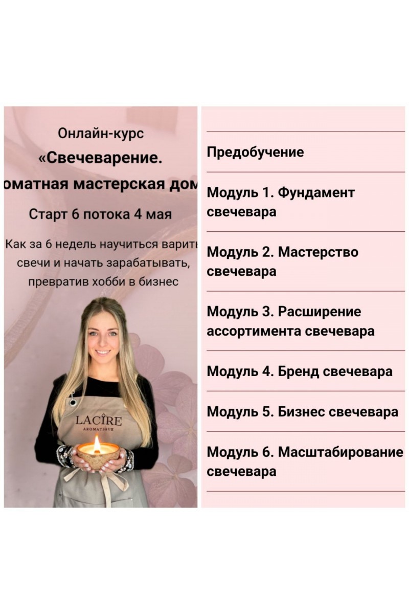 Программа курса:ПредобучениеМодуль 1. Фундамент свечевараМодуль 2. Мастерство свечевараМК соевая аромасвеча в контейнереМК кокосовая свеча в контейнереМК кокосовая ароматизированная свеча с посланиемМК по созданию свечи в кокосе с шиммеромМК по созданию кокосовой и соевой формовой свечи, работа с красителемМК по созданию кокосового и соевого аромасашеТеория по ароматам для дома. Простые правила созданияМК по созданию диффузора и автопарфюмаМК бальзам для губМодуль 3. Расширение ассортимента свечевараМК по созданию гипсовых изделийМК по созданию гипсового подсвечника для заливки воска и заливка свечи в этот подсвечникМК по массажным свечам и биовоску для ногтей и кутикулыМК по созданию интерьерного спреяМК по созданию твердых духовМК гипсовые изделия в технике тераццоМК кондитерская свечаМК свеча и аромасаше из оливкового воскаМК долго горящая свеча на основе двух восков соевый freshwax 100 и пальмовый freshwax 102. Украшение свечи поталью.Модуль 4. Бренд свечевараСоздаем свой бренд. Как придумать название бренда и сделать логотип самостоятельноФирменный стиль. Создание этикеток, работа с типографией и дизайнеромЦенообразование. Составление таблиц затрат и себестоимостиЮридические аспекты бизнеса. ИП или самозанятость. Как принимать платежиСезонность в свечеваренииОсобенности упаковки и доставки свечейМодуль 5. Бизнес свечевара