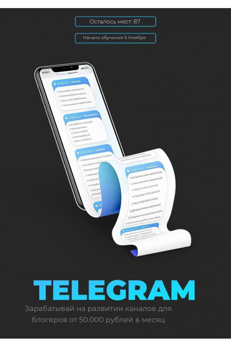 Почему Телеграм?ПростоБез вложений, начать можно довольно просто и быстро, без доп.знанийПрибыльноУже в первые 14 дней вы начнете зарабатывать по 10-20 тысяч рублейСтабильноЭто стабильный доход, который не пропадет или уйдет в минусКому подойдетХочешь перегрузиться и начать зарабатывать в онлайнеХочешь иметь стабильный приток клиентов и не бояться, что их не будетМечтаешь работать из любой точки мира, имея только смартфон и времяБоишься ошибок и хочешь сразу работать в своё удовольствиеПочему яХельга (helgaspataki)ЦенностьПотратила на курс 691.000 рублей, чтобы вы испытали вау эффект от обученияУпорствоБолее двух месяцев упорной работы, чтобы создать уникальный курсРезультатФокус группа, эксперты - все проверили курс, чтобы у вас был результатМОДУЛЬ 1 - Начало1. Как работать с Телеграм2. Рынок рекламы3. Каналы и блоги4. База профессий5. Боты и магазиныМОДУЛЬ 2 - Фундамент1. Позиционирование и тематики2. Смысловая нагрузка и тексты3. Визуал и оформление постов4. Формирование контента5. Структура продающего текста6. Способы заработка на канале7. Технические фишки с каналами8. Основные ошибки и фишкиМОДУЛЬ 3 - Каналы1. Что такое запуски обучений2. Сколько можно заработать3. Как подготовиться к запуску4. Контент и написание прогрева5. Психология продаж обучения6. Тех.моменты и сотрудники7. Основные проблемы и ошибкиМОДУЛЬ 4 - Запуски1. Разбор направлений2. Заработок и трудности3. Менеджер по рекламе4. Копирайтер (контенщик)5. Создатель ботов и дизайнерМОДУЛЬ 5 - Профессии1. Как быстро найти себе блогера2. Типы клиентов и возражений3. Места и поиск клиентов4. Структура и план диалога5. Как и когда брать оплату6. Делаем клиента постоянным7. Психология влияния на клиента8. Основные ошибки с клиентамиМОДУЛЬ 6 - Клиенты1. Как работать в удосольвтеи2. Найм первых сотрудников3. Повышения стоимости услуг4. Как расти через 2-3 месяца5. Основные ошибки при росте