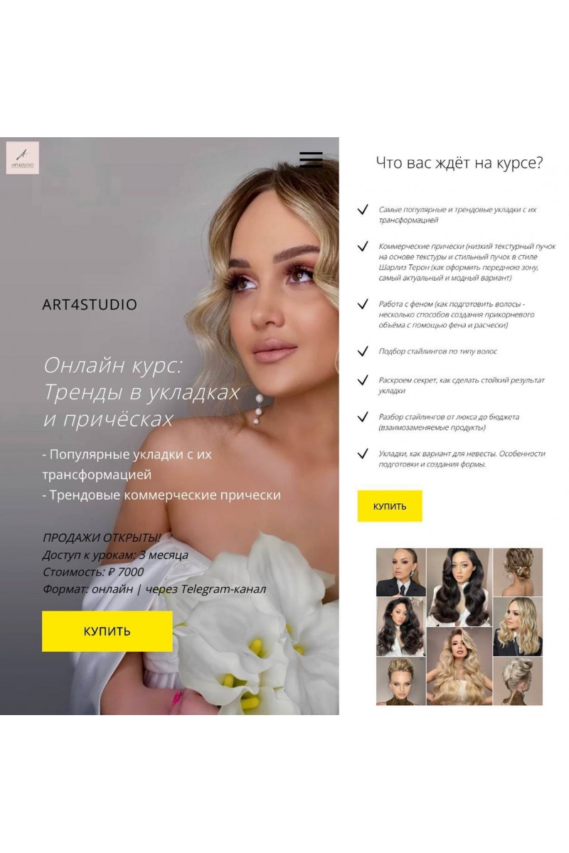 Только самая необходимая информация, которая позволит вам сразу начать работать и закупить те стайлинги, которые необходимы в работе.На курсе вы увидите, как продукты Lux-класса, так и их аналоги, которые мы активно используем в работе с клиентами.Что вас ждёт на курсе?Самые популярные и трендовые укладки с их трансформациейКоммерческие прически (низкий текстурный пучок на основе текстуры и стильный пучок в стиле Шарлиз Терон (как оформить переднюю зону, самый актуальный и модный вариант)Работа с феном (как подготовить волосы - несколько способов создания прикорневого объёма с помощью фена и расчески)Подбор стайлингов по типу волосРаскроем секрет, как сделать стойкий результат укладкиРазбор стайлингов от люкса до бюджета (взаимозаменяемые продукты)Укладки, как вариант для невесты. Особенности подготовки и создания формы.Для кого курс?для парикмахеров, которые хотят освоить трендовые укладки и быстрые варианты актуальных причёсокдля визажистов, которые хотят научиться делать красивые и модные укладкидля стилистов, для дальнейшего профессионального роста и обновления своих знанийпрофессионалам, которые хотят вдохновиться и освоить новые техникиПривет! Мы VIP-стилисты и создатели популярной студии - Art4StudioЮлия Кравчук:- Мастер международного уровня, действующий свадебный ТОП СТИЛИСТ, преподаватель обучающих курсов по причёскам- Дипломированный специалист, художник-модельер по прическам, опыт работы более 12 лет- Основатель студии Art4Studio, которая диктует стиль в причёскахАлена Фомина- Мастер международного уровня, действующий свадебный ТОП СТИЛИСТ, преподаватель обучающих курсов по причёскам- Стилист-визажист Premium класса и преподаватель Art4Studio- Опыт работы более 12 лет. Выполняет прически и макияж любой сложности