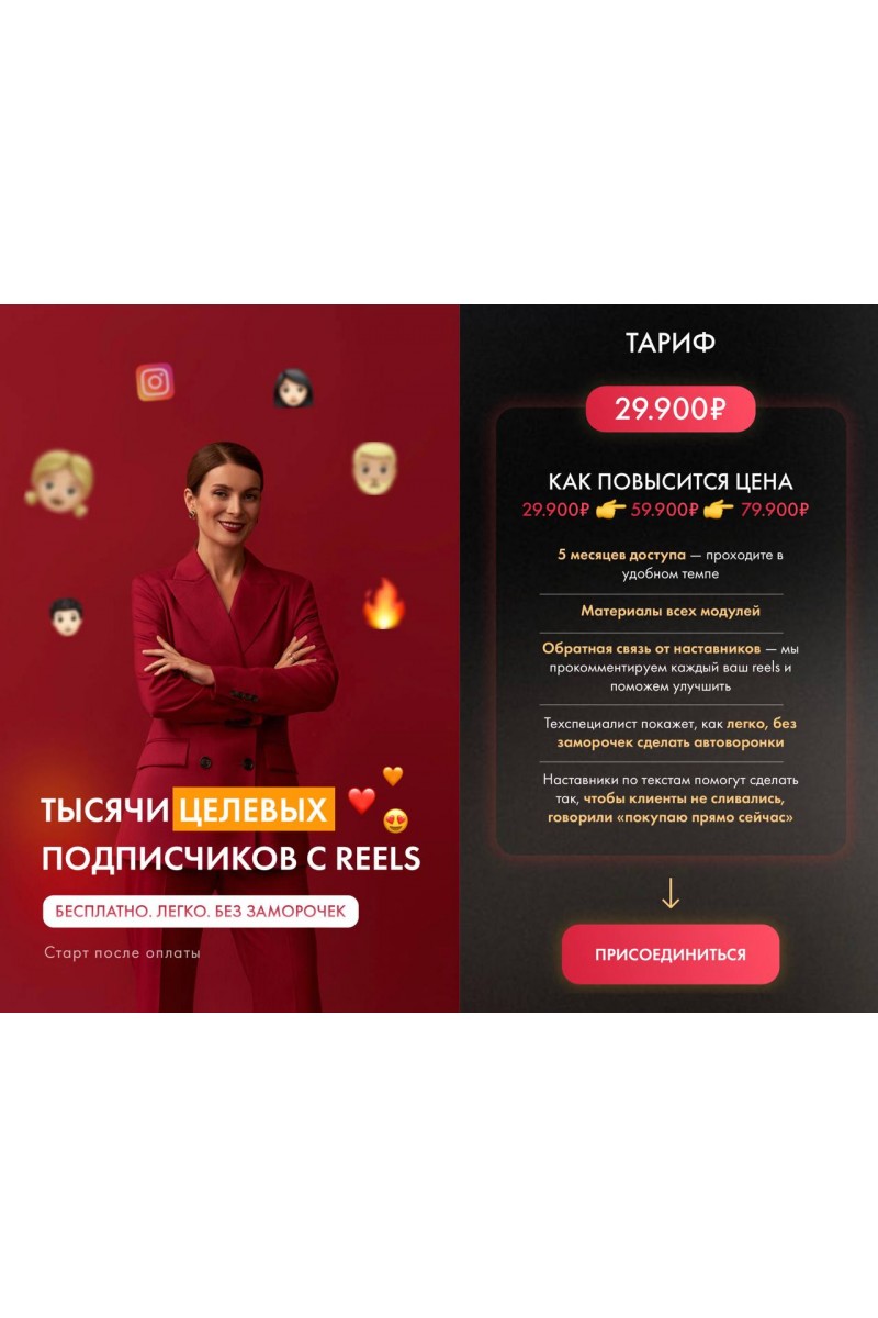 В результате reels становятся идеальным инструментом для привлечения аудитории и монетизации вашего делаПрограмма курсаМодуль 1Алгоритм reels — секрет, который важно знать, чтобы ваши reels заработалиТипы и форматы reelsКак легко искать идеи30 готовых сценариев, которые можно использовать раз за разом, добавляя разный контекстКак сделать reels на целый месяц за 90 минутСъемка и монтажКак сделать reels одновременно вовлекающим, прогревающим и продающим — даю технологиюКонтент-планМодуль 2Прогревы и продажи на автоматеАвтоматические прогревы в директ с reels — этим пока не пользуются 99% инстаграмщиков, а вы — будете впереди!Формулы прогревов + дадим шаблоныКак продавать каждый день на автомате — механикаПростые и понятные уроки, как это сделать легко технически + помощь нашего спецаМодуль 3Тексты для reels и воронокКак за 15 минут писать такие тексты под reels, чтобы их читали, прогревались и покупали очень быстроВсе типы текстов — освоите нашу технологию и уже не сможете остановиться, вы будете обожать писать, а ваши подписчики будут обожать вас читатьОсобенности текстов для воронок продаж — топ 7 секретов + шаблоныТексты для автопрогревовМодуль 4Анализ вашего инстаграмПодробно проанализируем, по каким причинам клиенты обходят ваш блог стороной, а подписчики не задерживаются. И четко расскажем, как это быстро исправить, чтобы с reels аудитория подписывалась на вас