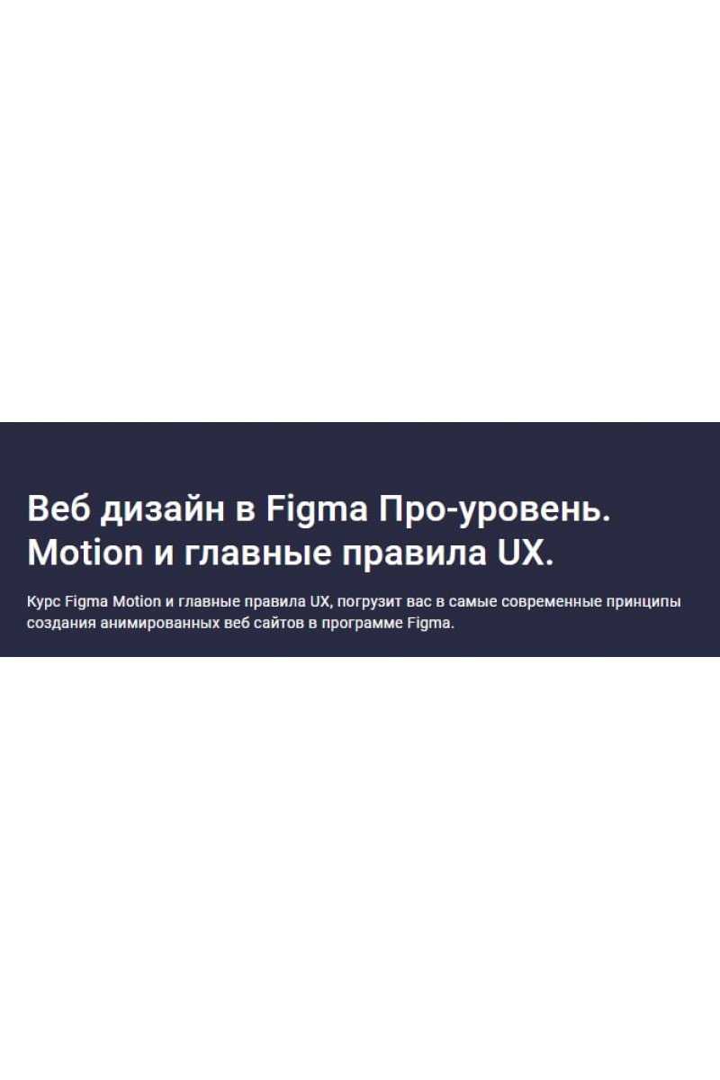 Веб дизайн в Figma Про-уровень. Motion и главные правила UX.Stepik.Дмитрий ФокеевКурс Figma Motion и главные правила UX, погрузит вас в самые современные принципы создания анимированных веб сайтов в программе Figma.Чему вы научитесьИзучите как создавать самые современные стили в FigmaУзнаете как создавать эффекты "стекла" на ваших сайтахУзнаете как создать 3D из любой фигуры или элемента в FigmaУзнаете современные способы использования и анимации градиентаУзнаете все о создании анимаций в FigmaНаучитесь создавать анимацию 360 градусов прямо в FigmaСможете создавать анимацию как на сайте appleНаучитесь анимировать любые элементы страницы сайта, такие как кнопки, гамбургеры и т.д.Научитесь использовать"Варианты" для создания впечатляющих анимацийУзнаете про стоковые площадки где вы найдете современную графику для ваших работНаучитесь использовать продвинутые плагины, которые позволят вам создавать собственные кастомные анимацииИзучите главные принципы пользовательского опыта с точки зрения "Юзабилити"Узнаете как пользователи в действительности используют веб браузерИзучите то как сделать ваш сайт простым и интуитивно понятным