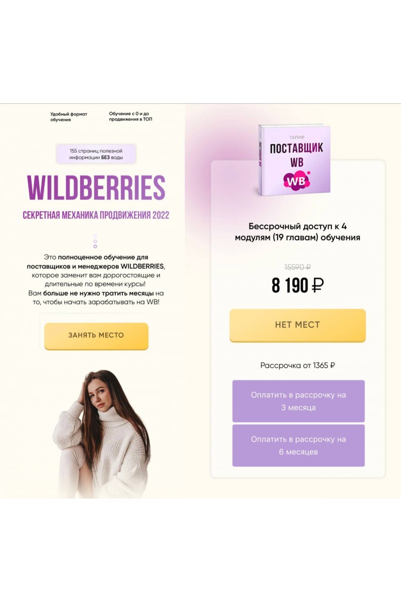 Модуль 1: Быстрая стратегия старта: выбор товара, анализ ниши и сертификация1. Почему стоит начать сотрудничество с WB?2. Регистрация ИП2.1 Кто может начать работать с WB? Можно ли без ип?2.2. Как и где оформить ИП?2.3. Какие налоги платит ИП?3. Выбор и поиск товара3.1. Как выбрать товар? Анализ спроса.3.2. Где закупить товар?3.3 Как продавать товар, если в моем городе нет склада ВБ?4. Сертификация4.1. Методы получения сертификата. Где найти сертификат бесплатно?4.2. Как продавать товары без сертификатов?5. Первый закуп товара5.1. С какого количества начать?5.2. Как начать продавать, не закупая товар заранее?Модуль 2: подготовка к поставке: ценообразование и уроки по регистрации карточки товара6. Ценообразование6.1. Как сформировать цену, чтобы всегда быть “в плюсе”?6.2. Логистика и комиссия. Пример расчета стоимости товара.7. Регистрация в личном кабинете поставщика8. Как WB платит поставщикам?9. Фулфилмент10. Регистрация карточки товара. Пошаговая инструкция.Модуль 3: организация отгрузки товара на склады WB: выбор модели поставки11. Маркировка и упаковка товара12. Варианты работы со складами. Модель поставки: FBO или FBS?12.1. Описания моделей поставок. Плюсы и минусы.12.2. Преимущества FBS13. Как организовать поставку FBO. Пошаговая инструкция.14. Работа со склада продавца (FBS).14.1. Работа со сборочными заданиями14.2. Организация поставки на склад FBSМодуль 4: секретная механика продвижения товара в ТОП15. Продвижение карточки товара15.1. Методы продвижения товара15.2. Принцип ранжирования карточек15.3. Почему мой товар не видят покупатели?15.4. Повышаем видимость товара15.5. Где разместить ключевые слова?15.6. Профессиональный анализ карточки товара самостоятельно15.7. Как сделать продающие фото? Пошаговый урок создания фото для товара в бесплатных приложениях15.8. Запуск нового товара. Как выделиться среди других поставщиков?15.9. Нужны ли самовыкупы? Секретная механика.15.10. Как повысить выкупаемость и снизить % возвратов15.11. Настройка рекомендованных товаров15.12. Генерация отзывов с высокими оценками15.13. Участие в акциях WB. Выгодно ли?15.14. Внешняя реклама15.15. Внутренняя реклама16. Отслеживание позиций товаров17. Анализ эффективности своей работы18. Работа с вопросами и отзывами клиентов19. Работа с вопросами и отзывамиМодуль 5: менеджер Wildberries20.1. Список услуг и их ценообразование20.2. Где искать клиентов? Список площадок20.3. Как эффективно предложить услуги и вызвать доверие? Работаем с возражениями20.4. Создаём кейс новичка20.5. Анализ карточки товара поставщика. На что обратить внимание? Даём рекомендации20.6. Выбор стратегии продвижения для товаров поставщика20.7. Составляем резюмеЗаключениедоступ к 4 модулям