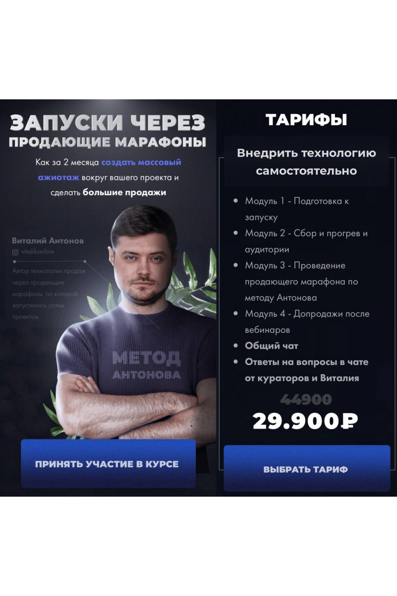 Определяем, кому, как и за сколько продаемСоздаем продукт, который купят.Определяем уникальную идеи и методику, которую будем продаватьДекомпозиция: рассчитываем, сколько можем заработать и сколько необходимо вложитьПланирование ключевых дат запускаУпаковка продукта в продающий сайтПодготовка продающего марафона: план прогрева в аккаунте и связка с продающимивебинарамиПодготовка к запуску таргетированной рекламы на холодный трафик и ретаргетингу аудиторииПодготовка профиля к трафикуРасписываем модель геймификации и заданий для вовлечения аудитории и роста активностиРезультат модуля:-Составлены четкие ТЗ на все процессы запуска- расписан график запуска- продукт проработан и упакован по смыслам- составлен план запуска прогрева по всем каналамМодуль 2. Сбор и прогрев аудиторииЗапуск таргетированной рекламы на холодный трафик + + +Запуск ретаргетинга + + +Прогрев контентом в аккаунте (пошаговый план по сторис, постам, Reels, эфирам, заданиям, вовлечению через чат-бот, постам и видео в телеграм канале) + + +Техническая подготовка всех сервисов + + +Сбор и продажи по предсписку + + +Результат модуля:- Запущен трафик и идет активный сбор аудитории напродающий марафон- Стартовал мощный прогрев холодной и теплой аудитории повсем каналам- Лиды собраны в предсписок, получены первые оплаты еще достарта беспатникаМодуль 3. Проведение продающего марафона по методу АнтоноваПодготовка к вебинарам марафона по авторской структуре, сбор идокрутка продающих презентаций + + +Контентая и игровая часть продающего марафона + + +Старт продаж с вебинаров марафона + + +Результат модуля:- Стартовал продающий марафон с высокойактивностью аудитории- Вовлечена аудитория, которая еще вчера о вас незнала и аудитория, которая отмалчивалась- Идут массовые продажи с вебинаров и с аккаунтаМодуль 4. Допродажи после вебинаровПростроим “дожим по Антонову" - одну из наиболее эффективных механик продаж, которая дает до70% всех оплат в запуске + + +Освоим 10+ инструментов для максимального увеличения продаж через любой канал + + +Запустим мощнейший продающий ретаргетинг + + +Устроим “прогрев наоборот" -плавно и мягко выведем из запуска всех, кто не впишется,чтобы не выжигать аудиторию + + +Постпрогрев после старта курса на следующий поток для заинтересованной но не купившей аудитории + + +Результат модуля:- Выстроена четкая цепочка дожима и допрогревааудитории по всем каналам- Оплаты продолжают идти вплоть до старта курса- Не купившая аудитория не выжигается, а плавновыводится из продаж и прогревается на следующийпоток