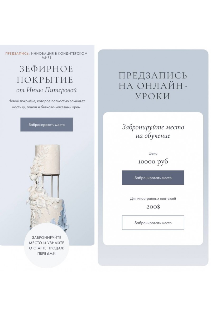 Зефирное покрытие - инновация в кондитерском мире, аналог мастике и дорогим покрытиям. Оно может полностью заменить мастику, ганаш и белково-масляный крем.С этим покрытием Вы:Уменьшите вес декора - он станет гораздо легчеСделаете современный текстурный декор (текстуру мрамора, бетона и объемные 3D-формы) быстро и дешевоСможете придать покрытию любой вкус от малины до экзотической маракуйиСэкономите на покрытии и декоре торта, полностью заменив ганаш, мастику или белково-масляный крем на зефирное покрытиеПо сравнению с ценой ганаша, используемого для покрытия и декора высокого ярусного торта, зефирное покрытие при аналогичном нанесении обойдется в 10 раз дешевлеДостоинства покрытия:Технология зефирного покрытия подходит новичкамБыстрый замесПрактически любой вкус зефирного покрытияЛегкое и экономичноеМягкое и одновременно прочноеХорошо переносит жаруМожно замораживать и покрывать велюромИспользуется как полноценное покрытие, а так же сверху крем-чиза, ганаша или белково-масляного кремаИдеален для моделирования 3D-фигур - цветов и фигурок из молдовИмеет несколько состояний для различных работ: зефир, нуга, пастила