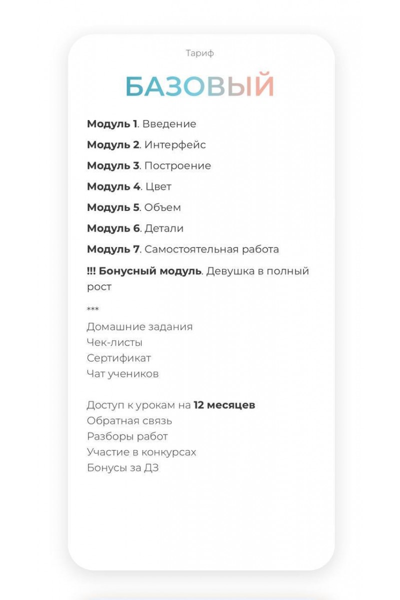На курсе тыНаучишься рисовать «сочные» иллюстрацииCоздашь полноценное портфолио из 7 работПрокачаешь свои навыки до профессионального уровняНаучишься работать в digital на своем устройствеПоймешь, как продвигать себя в социальных сетяхНаучишься находить клиентов и грамотно общаться с нимиСможешь начать зарабатывать на своем творчествеСтанешь частью сообщества единомышленников