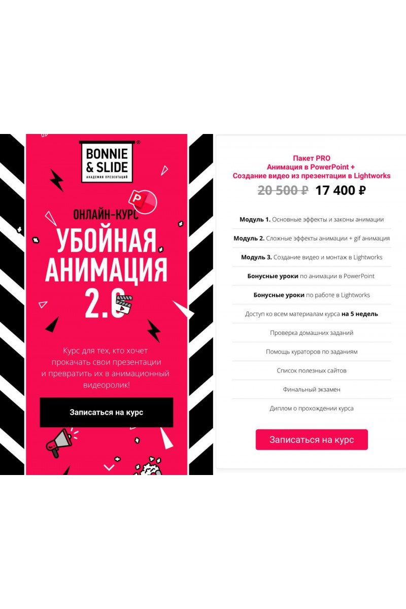 Для кого этот курс?Вы уже умеете рисовать красивые слайды, но хотите выделиться и привлечь еще больше внимания к вашей презентации с помощью анимации? Тогда этот курс для вас!Экспертам и спикерамДля тех, кто выступает перед публикой или коллегами и хочет усилить свои слайды анимацией и звукомМенеджерам и руководителямДля всех, кто хочет круто презентовать результаты своей работы или планы на будущееСтартаперам и предпринимателямЧтобы сделать убойное видео для продвижения своего проекта в соцсетях, на сайте или в YouTubeЧто у вас получитсяВ результате – анимированная WOW презентация и даже настоящий видеоролик!На курсе вы узнаете законы анимации, научитесь грамотно и быстро анимировать элементы слайдов и создавать эффектные переходы между слайдами в PowerPoint . А еще сможете смонтировать из презентации крутой видеоролик со звуком и музыкой, который с гордостью можно показывать на самой важной встрече. Огонь?Программа курсамаксимум практики на реальных слайдах из презентаций