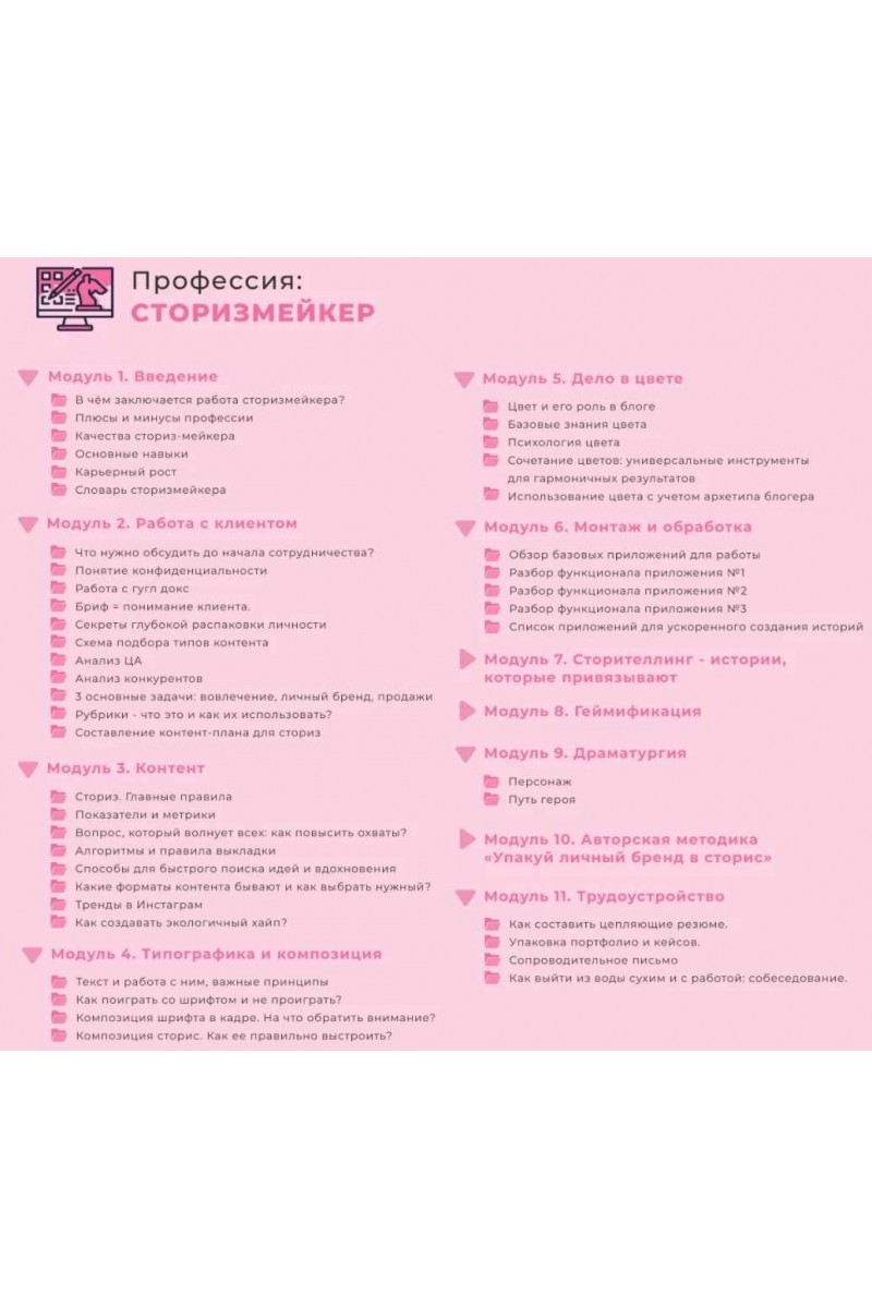 ДЛЯ КОГО? ДЛЯ ТЕХ, КТО:ХОЧЕТ УПЛЫТЬ В ОНЛАЙНВы, наверняка, много слышали о фрилансе. Но не могли понять, кем лучше стать. Может вы даже пытались перейти на удалёнку, но результат вас не обрадовал?Преподаватели Академии за руку доведут вас до первого клиента. Вы изучите самые актуальные инста-профессии, научитесь упаковывать себя и зарабатывать из любой точки планеты.УЧИТСЯ ИЛИ ИЩЕТ ПОДРАБОТКУКопите от зарплаты до зарплаты на новые сапоги? Или просиживаете бесполезные лекции в универе, а после думаете, как бы классно было сходить в ресторан? Ждать - не нужно. Нужно делать.Заработок в онлайне легко совместить с учебой или другой работой - особенно, если речь идет об инста-профессиях.В академии вы получите все необходимые инструменты и знания. После обучения вы не останетесь без клиентов!Мы поможем их найти.НЕ ХОЧЕТ ВЫХОДИТЬ НА РАБОТУ ИЗ ДОМАКаждый день работа заставляет вас уходить на 9-10 часов из дома. Быть может, вы недавно стали мамой и не хотите оставлять семью без тепла и любви. Но реалии заставляют вас обменивать время на деньги.И его невозможно вернуть близким или нагнать за выходные.Поступив обучаться в академию, вы сможете всегда быть рядом с любимыми. И при этом точно не потеряете в заработке. Для этого мы обучаем наиболее востребованным профессиям на рынке онлайн-работы.ОТУЧИЛСЯ - НО НЕ ПОЛУЧИЛ РЕЗУЛЬТАТУже учились по схожим направлениям у наших конкурентов? Но так и не вышли на стабильный доход, а найти адекватный проект сложно? Повысить квалификацию и наконец найти клиентов поможет обучение в Академии.Вы изучите подходящую вам специальность и прямо во время обучения сможете применять все полученные знания в рабочих проектах!ХОЧЕТСЯ ВЕСТИ БЛОГ САМОСТОЯТЕЛЬНОСторизмейкер выписал чек на 30 тысяч, а прогревщик к 15 оплаченым просит ещё процент с продаж? Да, цена оправдана.Но не у всех начинающих блогеров есть возможность выделить из бюджета такие суммы.Ведение сториз, продвижение себя на площадках, развитие ТикТока и перегон оттуда аудитории и конечно же продажи - не более чем набор навыков. И каждому из них можно обучиться в Академии.УСТАЛ, ЧТО ДЕНЕГ ВСЕГДА "НЕ ХВАТАЕТ"Деньги - это не только про комфорт.А еще и про безопасность и здоровье: оплатить поход к любому врачу, получить достойное образование, жить в безопасном районе, питаться качественными продуктами. Деньги - можно зарабатывать.Если получить востребованную профессию.Instagram сейчас — самая перспективная площадка для заработка. Ежедневно на рынке появляются 300-400 платежеспособных экспертов, которые нуждаются в вашей помощи. Найти клиента - не проблема, если вы высококлассный специалист. Готовы зарабатывать больше?Что получите в результате?- Профессию которую вы полюбите и которая принесёт вам хороший доход- Самые актуальные знания от топ-специалистов сферы- Сертификат о прохождении курса- Домашние задания, подходящие для портфолио- Упакованное резюме, портфолио и при желании, продающий профиль в Insta- Весь необходимый объем soft-skills- Возможность стажировки