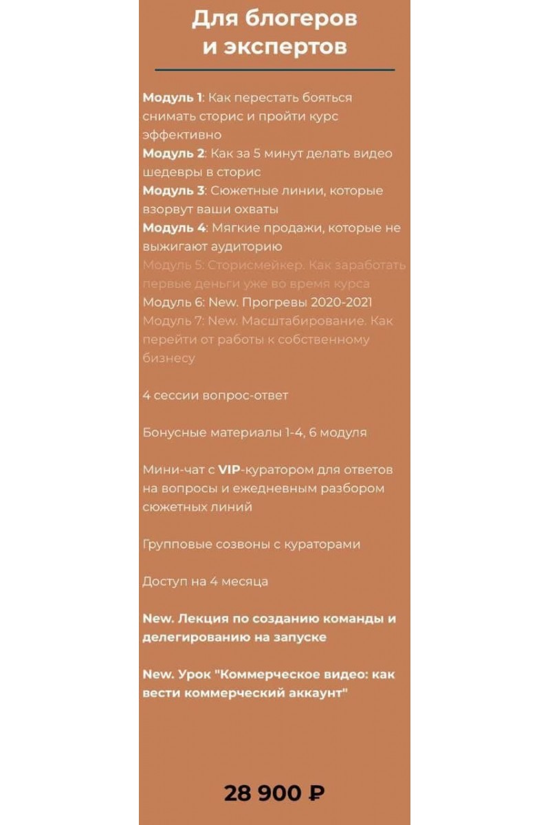 Приготовьтесь к полному погружениюМы расскажем, как начинать делать сториз, перестать бояться камеры и понять, как снимать новые сториз, даже если вы не выходите из квартиры неделями. Заполним пробелы в знаниях о монтаже и сюжетной линии.Вы поймете, как делать сториз, даже если не выкладывали их ни разу. Составите стратегию своего блога, научитесь монтировать…. и вплетать продажи так, что подписчики будут хотеть больше сториз.И начнете работу в сторисмейкинге — самой востребованной нише в инстаграме.«БОГАТЫЙ СТОРИСМЕЙКЕР» - ваш доступ в мир, где на сторис можно зарабатывать уже во время обучения