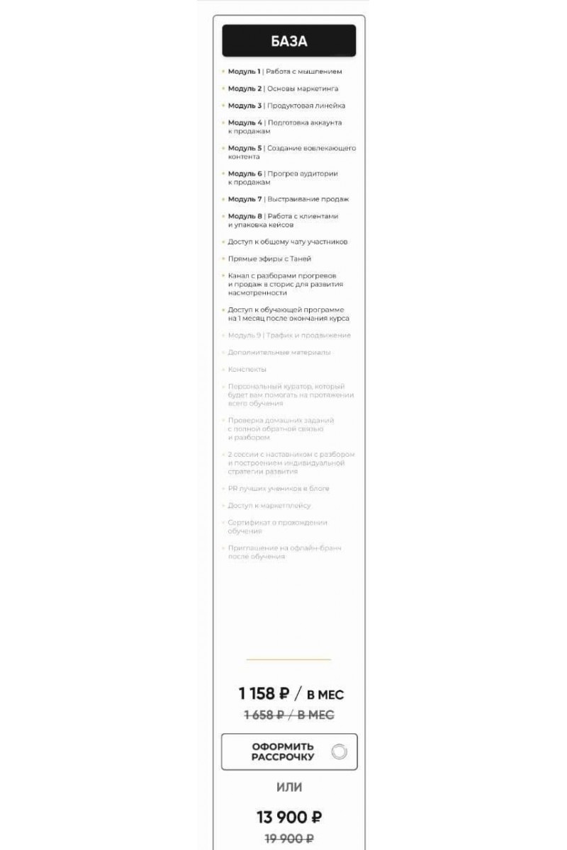 За время курса вы освоите навыки упаковки блога с нуля, внедрение экспертного контента, создание воронок продаж через сторис и секретные фишки, которые помогут привлекать клиентов и продавать свои услуги легко и дорого.ПрограммаМодуль 1. Работа с мышлениемМодуль 2. Основы маркетингаМодуль 3. Продуктовая линейкаМодуль 4. Подготовка аккаунта к продажамМодуль 5. Создание вовлекающего контентаМодуль 6. Прогрев аудитории к продажамМодуль 7. Выстраивание продажМодуль 8. Работа с клиентами и упаковка кейсов
