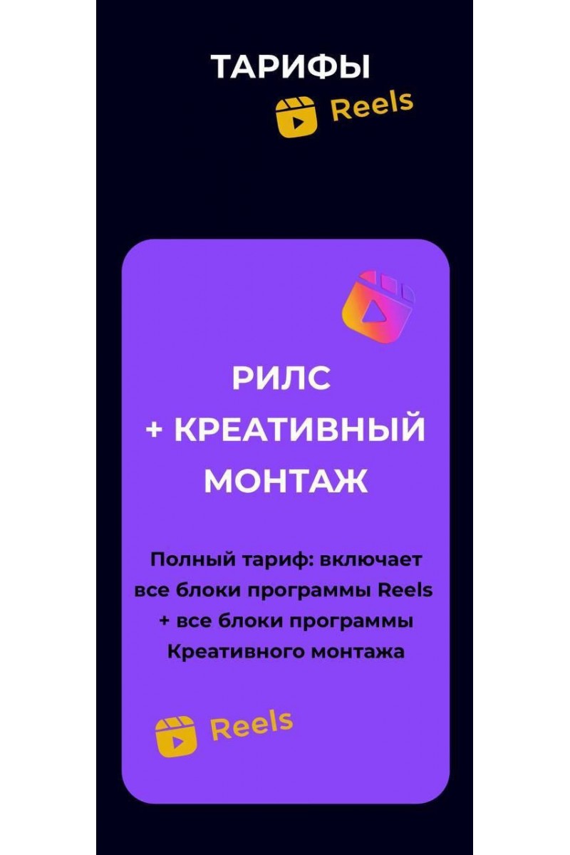 Это самый полный тариф, включающий в себя все блоки креативного монтажа и все блоки рилс.ДЛЯ КОГО ПОДХОДИТ?Если ты блогер, эксперт, контентмейкер и понимаешь, что качественные рилс — основной инструмент бесплатного продвижения. Но у тебя:не хватает знанийролики не заходят, сюжет и качество видео слабыенет подписок и продаж через рилс ты просто не знаешь с чего начать и как исправить ситуациюПрограмма курса по креативному монтажуМодуль 1. Вводная информацияМодуль 2. Техническая информацияМодуль 3. СветМодуль 4. МузыкаМодуль 5. МатчкатМодуль 6. Работа с маскамиМодуль 7. Замена светаМодуль 8. ХромакейМодуль 9. Работа с эффектамиМодуль 10. Атмосферное видеоМодуль 11. ИдеиМодуль 12. Работа с клиентамиМодуль 13. ЗавершающийПрограмма курса по ReelsМодуль 1. Вводный модульМодуль 2. АлгоритмыМодуль 3. Упаковка профиляМодуль 4. Идеи и режиссураМодуль 5. Музыка и трендыМодуль 6. Качество рилсМодуль 7. Оформление рилс и легкий монтажМодуль 8. Образ в рилсМодуль 9. Как побороть страх и хейтеровМодуль 10. Работа с новой аудиториейМодуль 11. Проблемы рилсМодуль 12. Работа с заказчикомМодуль 13. Завершающий