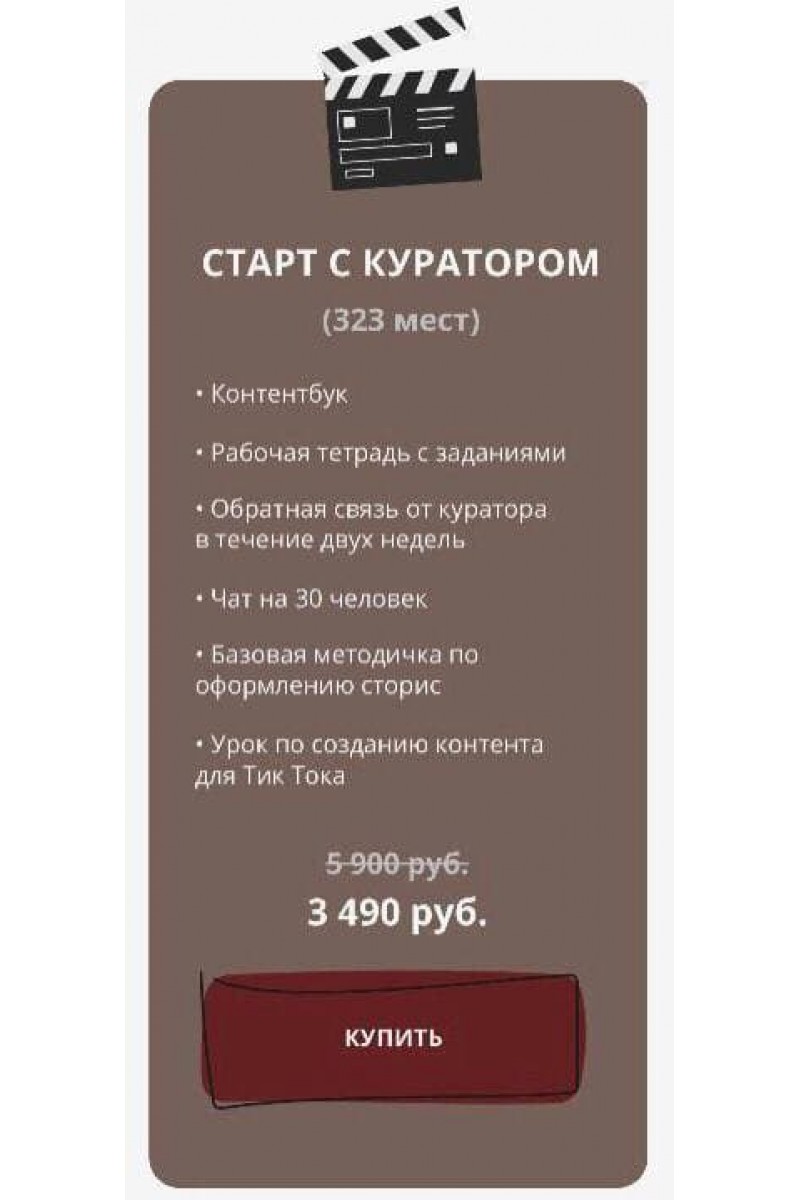 Создай свою историю успехаСТАРТ С КУРАТОРОМ• Контентбук• Рабочая тетрадь с заданиями• Обратная связь от куратора в течение двух недель• Чат на 30 человек• Базовая методичка по оформлению сторис• Урок по созданию контента для Тик Тока