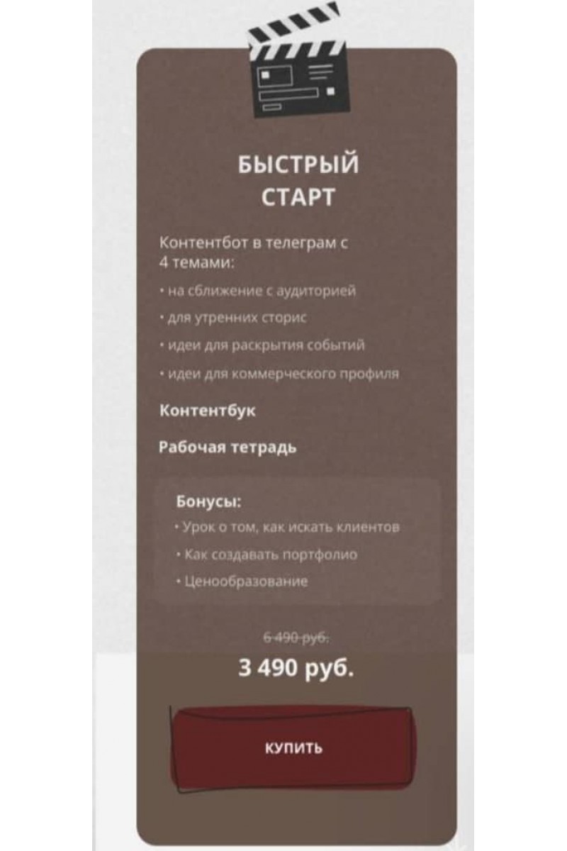 Что такое контентботЭто закрытый телеграм бот, в котором собрано более 200 идей по категориямна сближение с аудиториейдля утренних сторисидеи для раскрытия событийидеи для коммерческого профиля+Рабочая тетрадь+Контентбук+Бонусные уроки