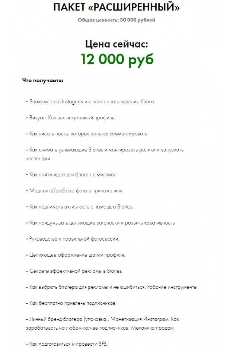 Знакомство с Instagram и с чего начать ведение блога.Визуал. Как вести красивый профиль.Как писать посты, которые хочется комментироватьКак снимать увлекающие Stories и монтировать ролики и запускать челленджиКак найти идею для блога на миллион.Модная обработка фото в приложениях.Как поднимать активность с помощью Stories.Как придумывать цепляющие заголовки и развить креативностьРуководство к правильной фотосессии.Цепляющее оформление шапки профиля.Секреты эффективной рекламы в Stories.Как выбрать блогера для рекламы и не ошибиться. Рабочие инструментыКак бесплатно привлечь подписчиковЛичный бренд блогера (упаковка). Монетизация Инстаграм. Как зарабатывать на любом кол-ве подписчиков. Механика продажКак подготовиться и провести SFS.Эффективная настройка таргетированной рекламы.Как подготовиться к конкурсам GiveAway.Монетизация. Как зарабатывать от150 000 рублей в месяц в Instagram.Деньги на марафонах, рекламе и закрытых группахДеньги в партнерских программах и как найти рекламодателейКак писать сообщения блогерам и брендамКак увеличить эффективность рекламы в 4 разаКейсы эффективных рекламных кампаний. С примерами и цифрами продажКак писать продающие текстыМеханика бесплатного попадания в СМИ, паблики и на ТВКак увеличить вовлеченность в аккаунтПсихология влиянияКоллаборации для продвижения