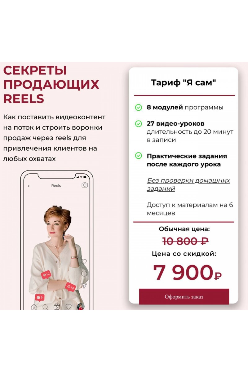 1 МОДУЛЬВы узнаете, зачем вашему бизнесу short-видео и как с их помощью привлекать подписчиков и платежеспособных клиентов.2 МОДУЛЬСоставите воронку продаж через reels и определите стратегию максимального охвата для вашего профиля.3 МОДУЛЬСоставите контент-план под ваши видео для Instagram и/или других соцсетей. Научитесь привлекать внимание вашей ЦА+ готовые универсальные темы для рилс4 МОДУЛЬУзнаете принципы быстрого и простого создания роликов без больших затрат времени и сил.5 МОДУЛЬПоймете, как использовать reels для органического роста вашего блога без затрат на таргет и рекламу у блогеров.6 МОДУЛЬНаучитесь регулярно постить топовые reels и привлекать ими клиентов с вашим минимальным вовлечением.7 МОДУЛЬВы научитесь правильно работать с аудиторией в формате экспресс-видео. А еще начнете использовать самые эффективные триггеры в своих продающих reels.8 МОДУЛЬВы начнете снимать захватывающие внимание и вовлекающие reels. Их будут не только досматривать до конца, но и радовать вас реакциями, ответами и покупками.