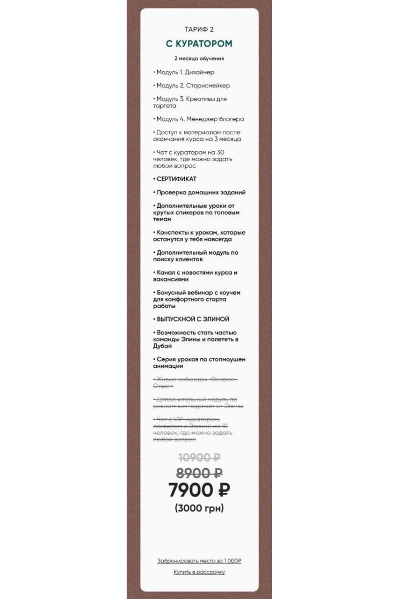 Что тебя ждет за 8 недель?32 урока — концентрация самых востребованных специальностей в одном курсе. Каждый ученик выйдет с портфолио и опытом работы, а топовые преподаватели влюбят тебя в онлайн.Автор программы — Элина Чеботарева. Блогер 1.4 млн подписчиков и основательница курса «Школа помощников блогера»Приглашенные спикеры и эксперты. Топовые специалисты расскажут тебе о своей профессии в деталях, объяснят, как искать клиентов, и придадут уверенности в себе на собственном примере.Обратная связь от кураторов.Мы создаем небольшие чаты для участников и проводим тщательный отбор сотрудников.Модуль 1. Дизайнер• Модуль 2. Сторисмейкер• Модуль 3. Креативы для таргета• Модуль 4. Менеджер блогера• Дополнительные уроки от крутых спикеров по топовым темам• Конспекты к урокам, которые останутся у тебя навсегда• Дополнительный модуль по поиску клиентов• Канал с новостями курса и вакансиями• Бонусный вебинар с коучем для комфортного старта работы