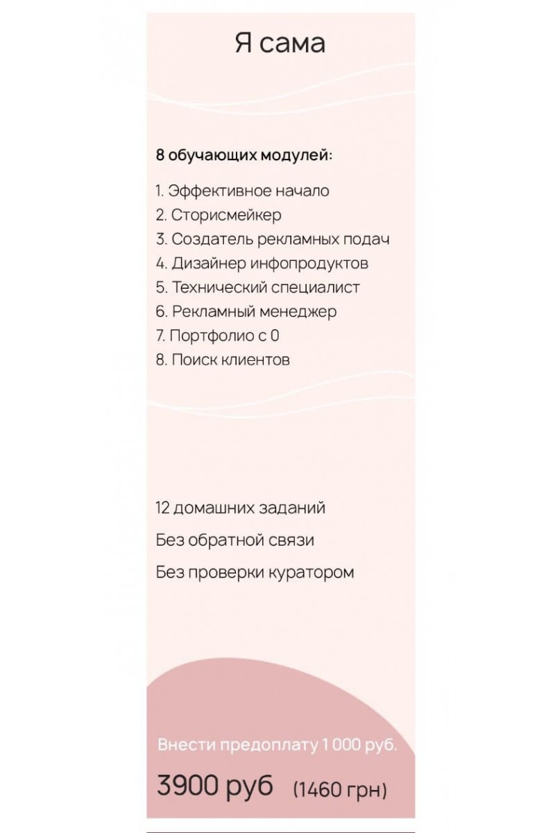 Для кого этот курс:БЛОГЕР. Вы хотите больше зарабатывать на своих услугах и рекламе. А также меньше вкладывать в продвижениеНОВИЧОК. Если вы никогда не работали онлайн и ничего не умеете.ИНСТА-РАБОТНИК. Вы уже работаете онлайн, но за скромную оплату. У вас мало клиентов и кейсовПрограмма курса:Модуль 1: Дизайнер инфопродуктовМодуль 2: СторимейкерМодуль 3: Технический специалистМодуль 4: Рекламный менеджерМодуль 5: Создатель рекламных подач