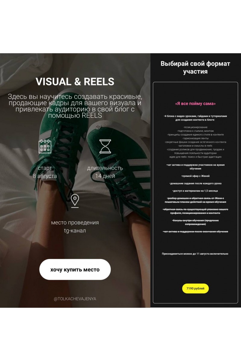 Кому точно нннада?•лайфстайл блогам, новичкам и экспертам•кто хочет создавать визуал и REELS для блога не напрягаясь из того, что вас окружает ежедневно•кто не знает как и что снимать для своего контента, что бы цеплять аудиторию и транслировать свои ценности•кто постоянно делает фото, но красивой ленты так и не получается•кто не знает что такое смыслы, как в их вшивать в контент, что бы люди подписывались и росли продажи ваших услуг•кто хочет, что бы REELS создавались легко и быстро•кто хочет сформировать единый и узнаваемый стиль своегоблога•кто хочет превратить создание контента для блога в привычное, легкое и приятное занятие, не требующим временных и финансовых затратПосмотрите ниже карусели с контентом, созданным не выходя из зоны комфортачто будет ?от твердого и яркого позиционирования до создания продающего контентапо дороге за кофе1-й блок•позиционирование как фундамент для создания контента и продвижения2-й блок•правила самой комфортной съемки•монтаж•поиск идей•подготовка к съемке3-й блок•гармонизация ленты•принципы создание единого стиля в контенте•тренды и адаптация•секретные фишки для создания эстетичных фото и видео4-й блок•заголовки и смыслы в reels•создание роликов для продвижения, продаж и повышения лояльности аудитории•идеи для reels- где брать и как быстро адаптироватьа что еще ?•домашние задания после каждого блока•проверка домашних заданий с обратной связью и пошаговым планом выполнения•лояльное комьюнити в виде чата-актива с поддержкой участников•прямые эфиры с Женей•видео-уроки•гайды и туториалы•понятные и простые инструкции с примерами